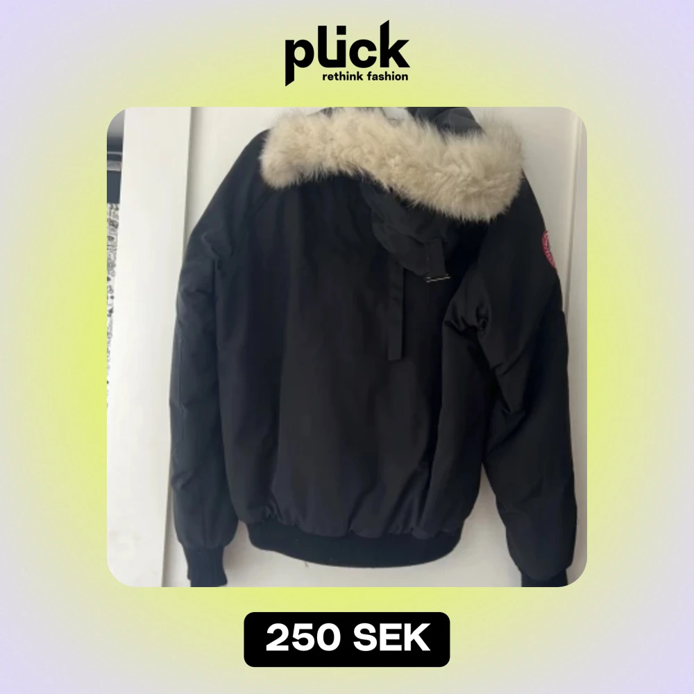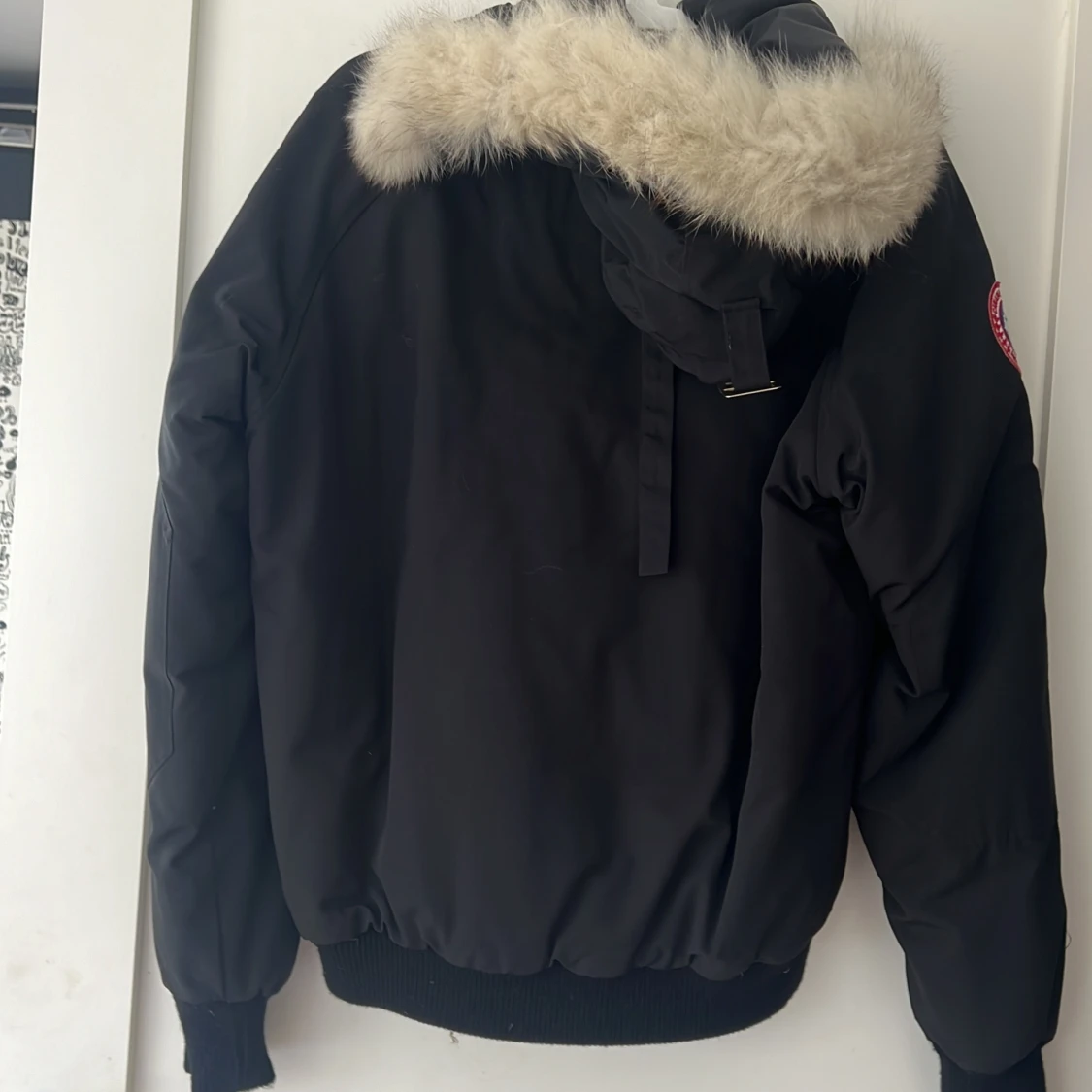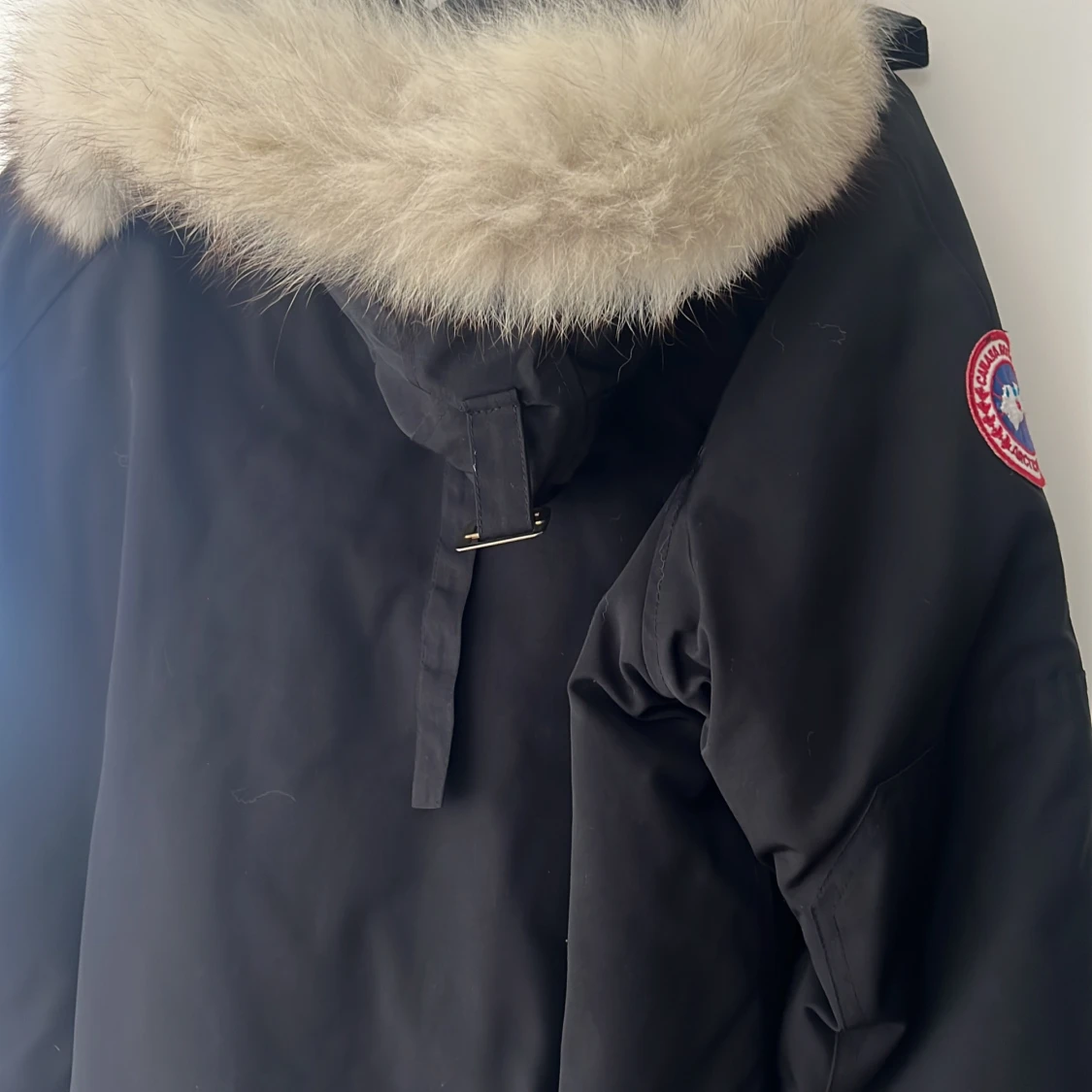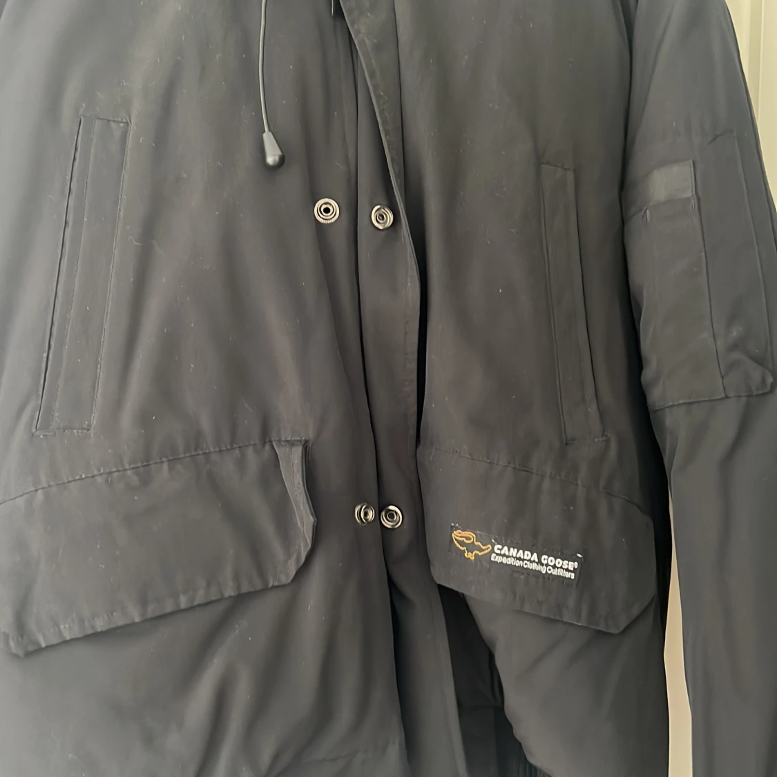 En svart jacka från Canada Goose med en pälsfodrad huva. Jackan har en dragkedja och knappar framtill samt flera fickor. Märkets logotyp är synlig på ärmen.