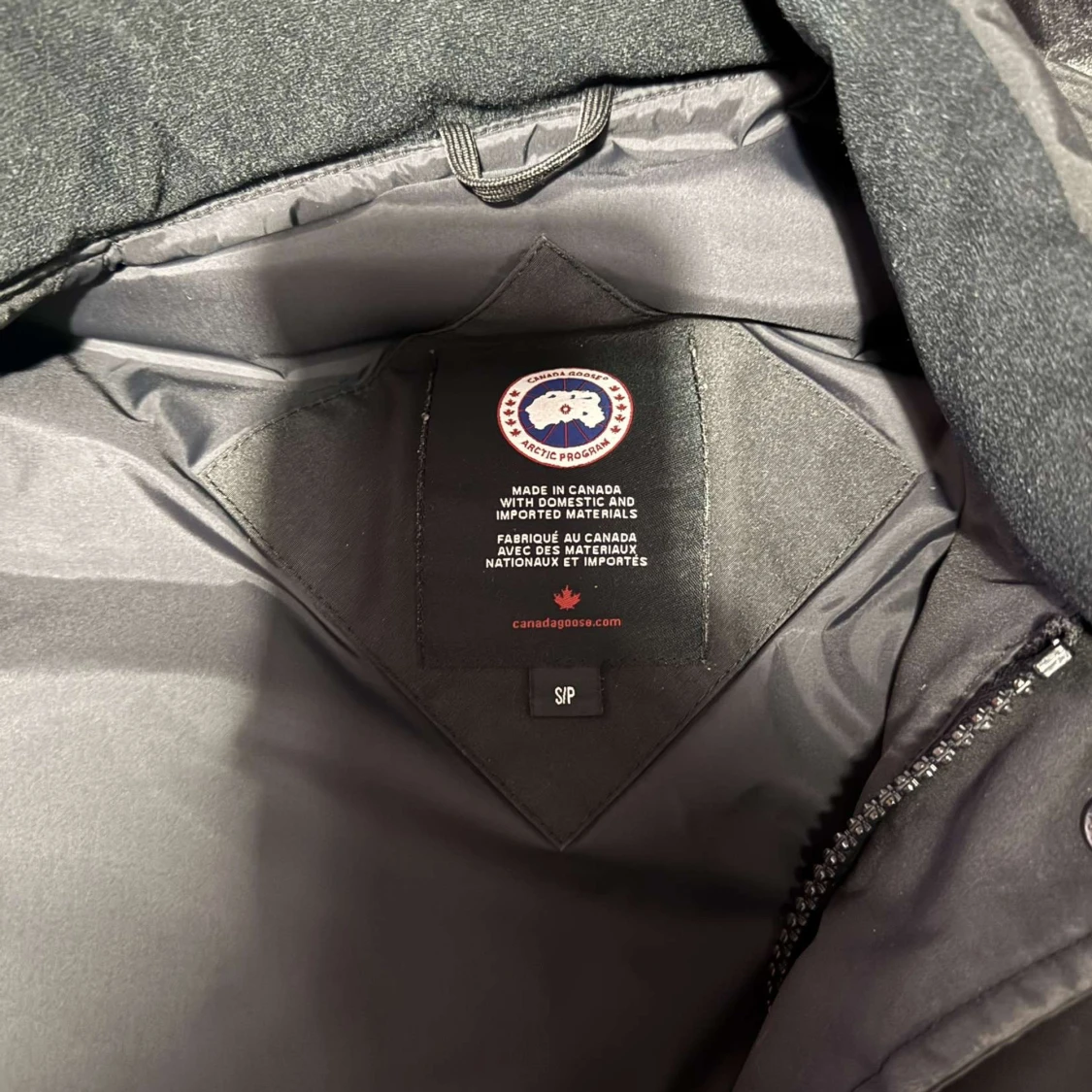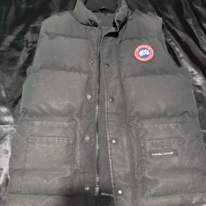 Säljer en svart dunväst från Canada Goose med dragkedja och knappar. Västen har en broderad logotyp på bröstet och praktiska fickor framtill. Perfekt för kyligare dagar. Ser bättre ut i verkligheten (Äkta)!!!