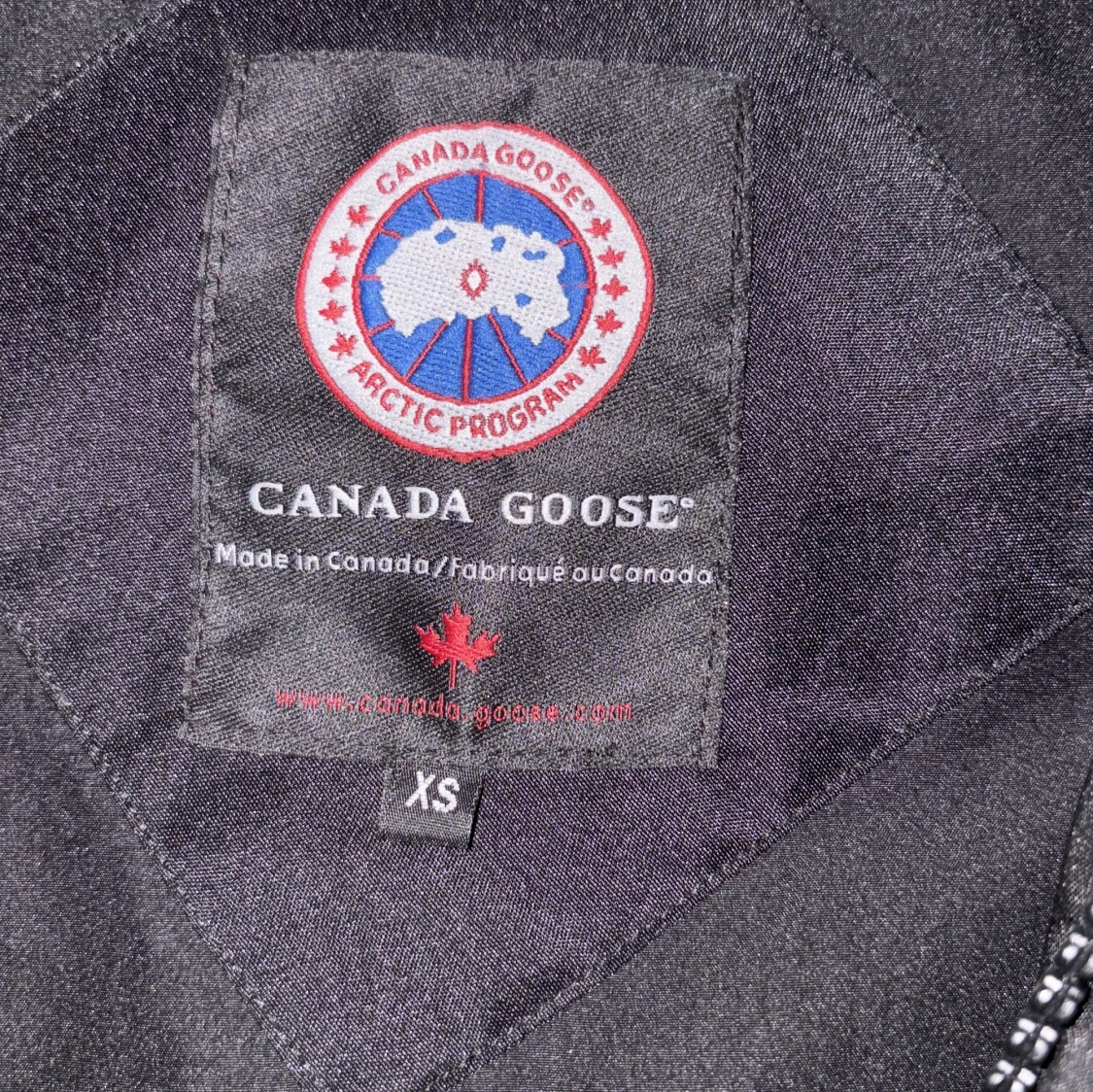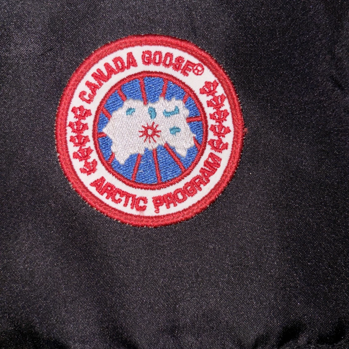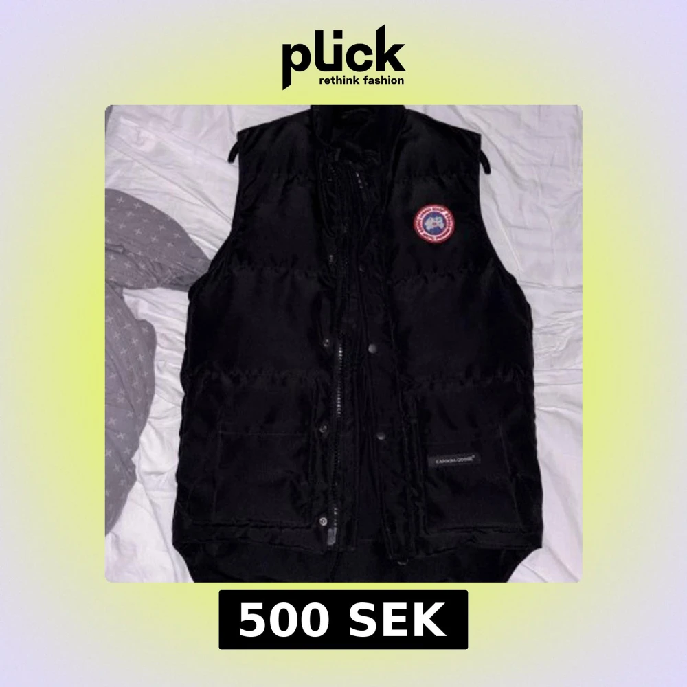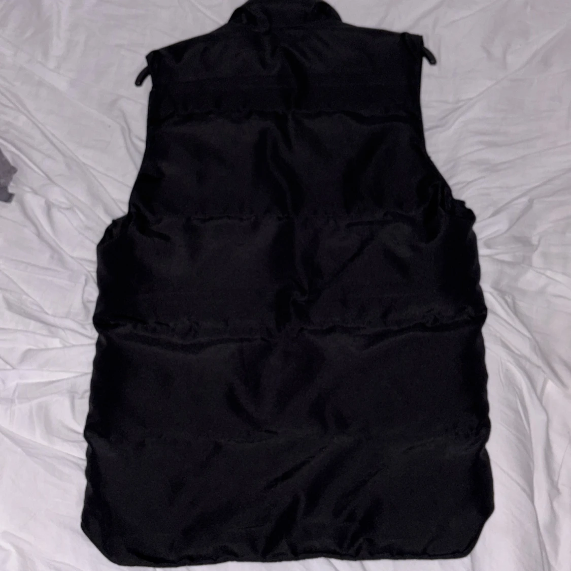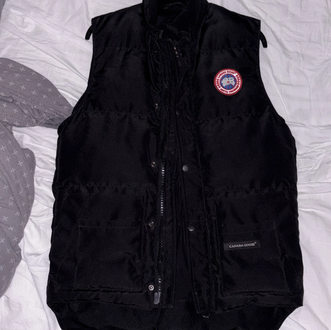 Säljer en svart dunväst från Canada Goose med klassisk logotyp på bröstet och diskret varumärkeslapp vid fickan. Västen har dragkedja och knappar framtill och är perfekt för lager-på-lager-stil.