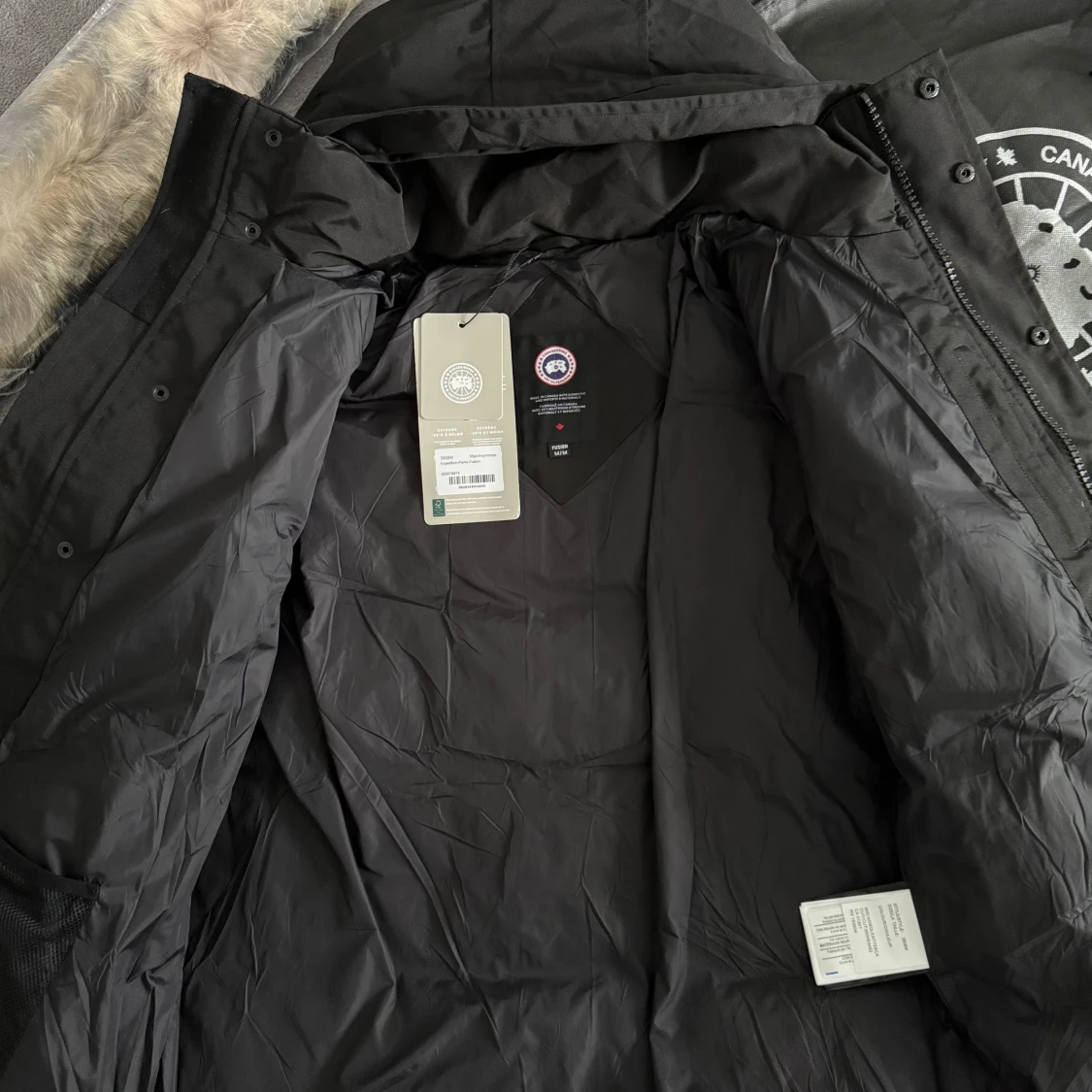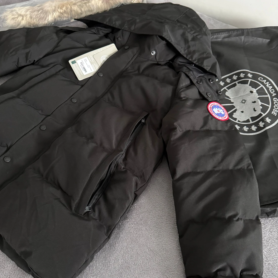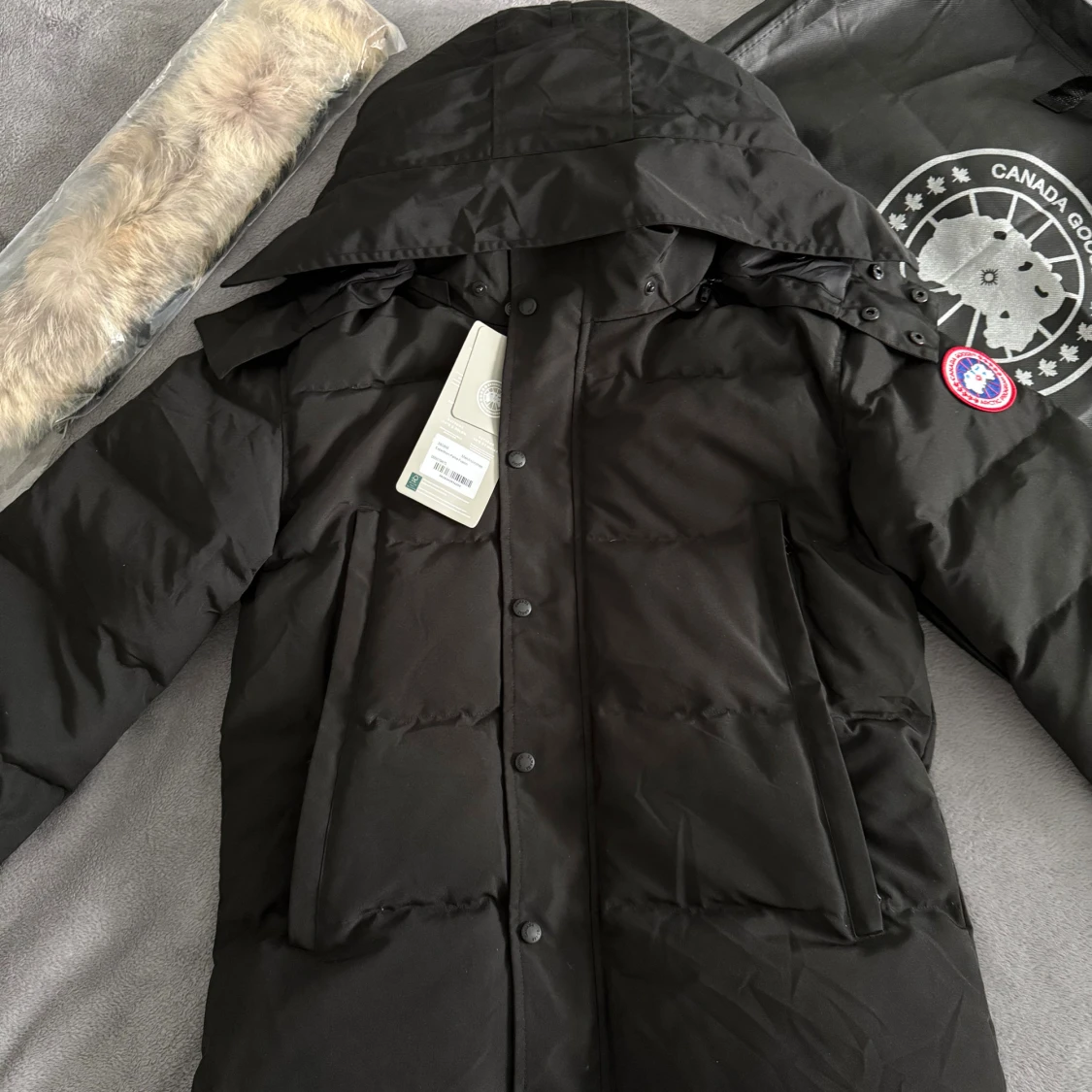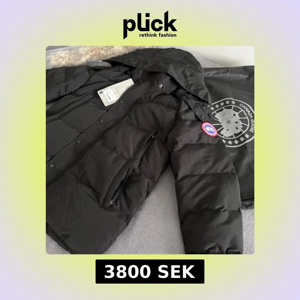 Säljer en svart dunjacka från Canada Goose med huva och avtagbar pälskant. Jackan har klassisk logotyp på ärmen, stora fickor med dragkedja och tryckknappar framtill. Perfekt för kalla vinterdagar och har en clean, stilren look.