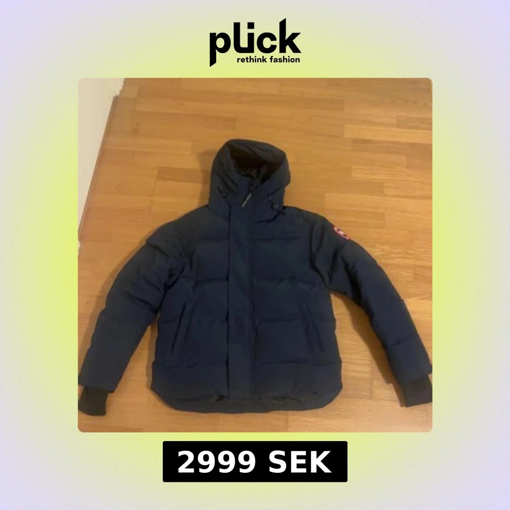 Canada Goose jacks - Säljer en mörkblå dunjacka från Canada Goose med huva och det klassiska märket på ärmen. Jackan är perfekt för kalla dagar och har en stilren design. Jackar funkar även i lite varmare väder då den passar till många outfits. Säljer jackan billigt eftersom de lilla hålet på ryggen. Man märker det knappt. Orginal påsen tillkommer ochså vid köp