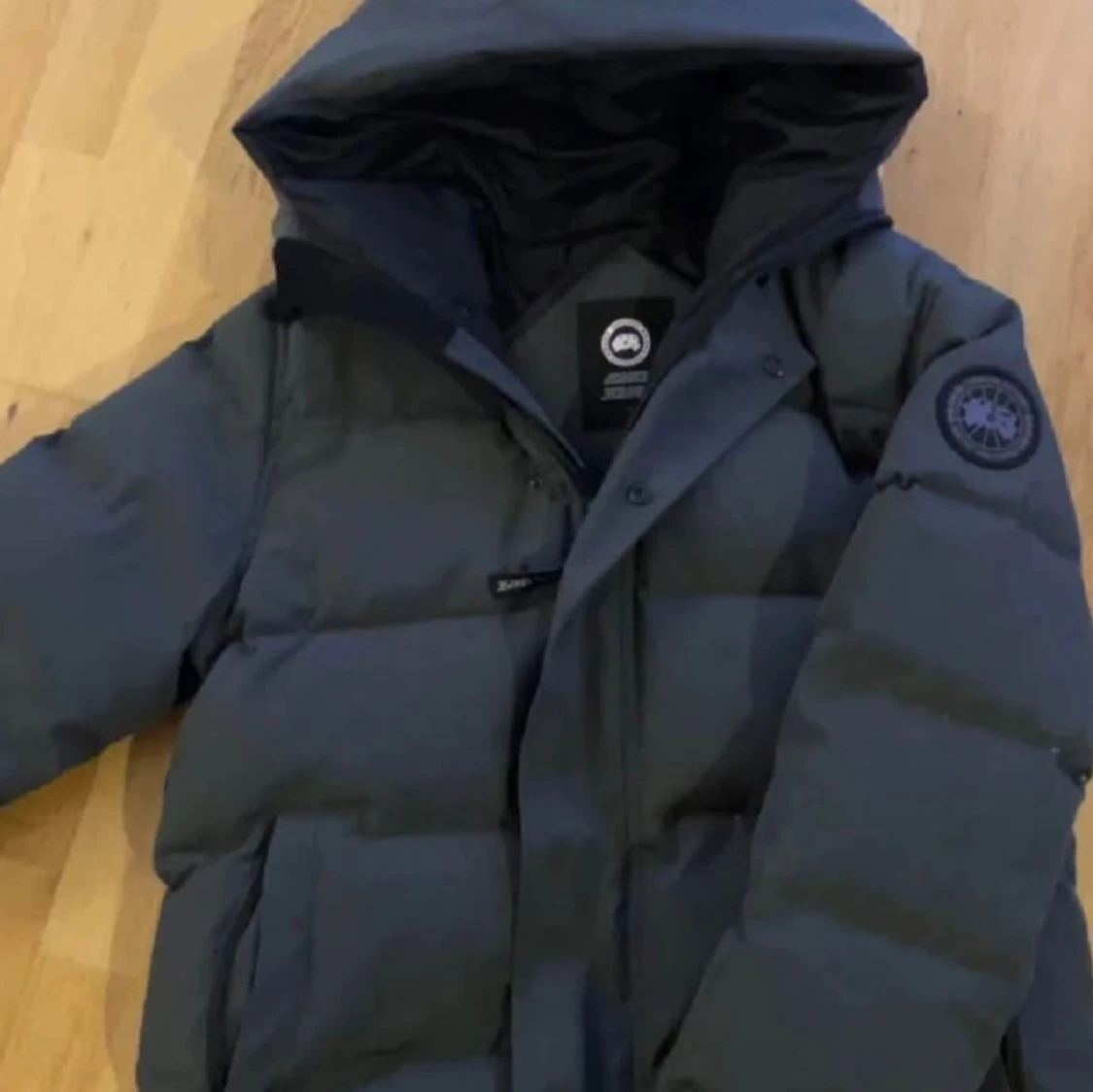 Säljer en mörkgrå pufferjacka från Canada Goose med huva och klassisk logga på ärmen. Jackan har dragkedja och knappar framtill, samt stora fickor. Perfekt för kalla dagar och har en riktigt schysst streetstil.
