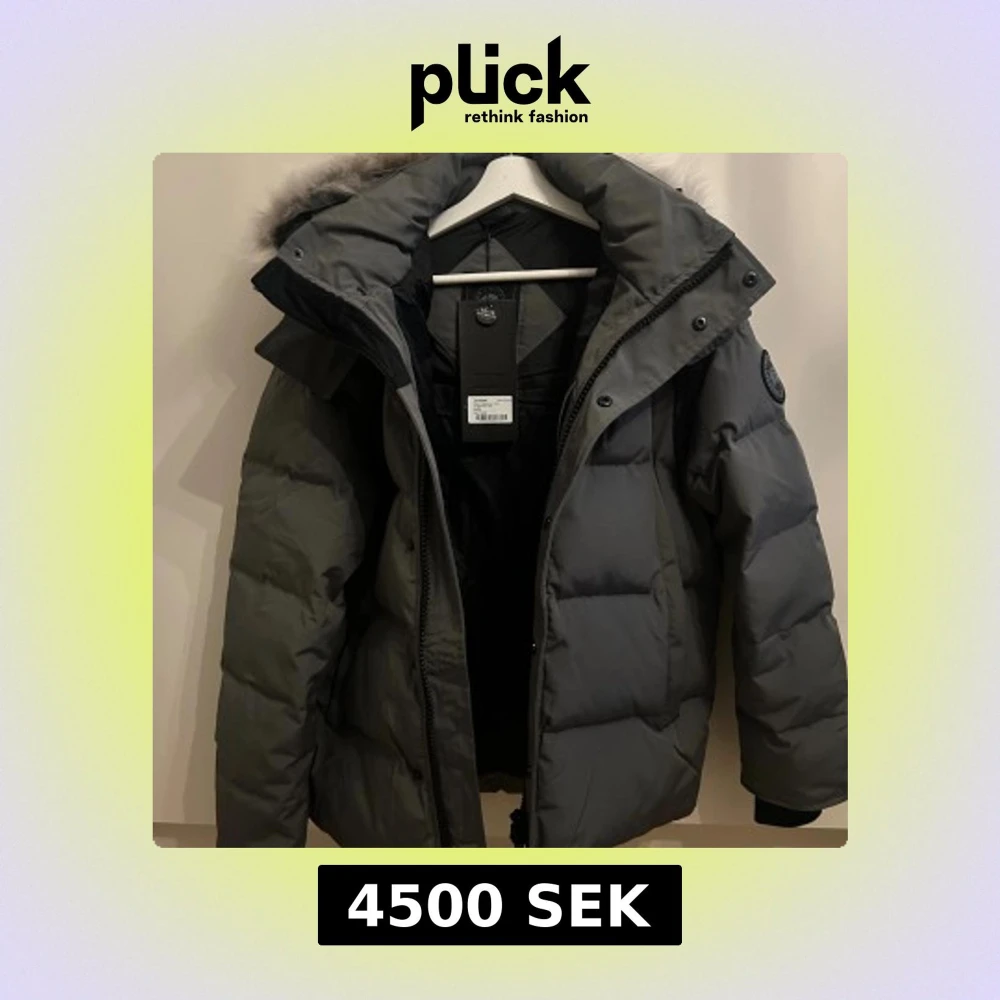 Säljer en grå dunjacka från Canada Goose med stor huva och lyxig pälsdetalj. Jackan har klassisk patch på ärmen, dragkedja och knappar framtill samt quiltad design. Perfekt för kalla vinterdagar och riktigt snygg passform.