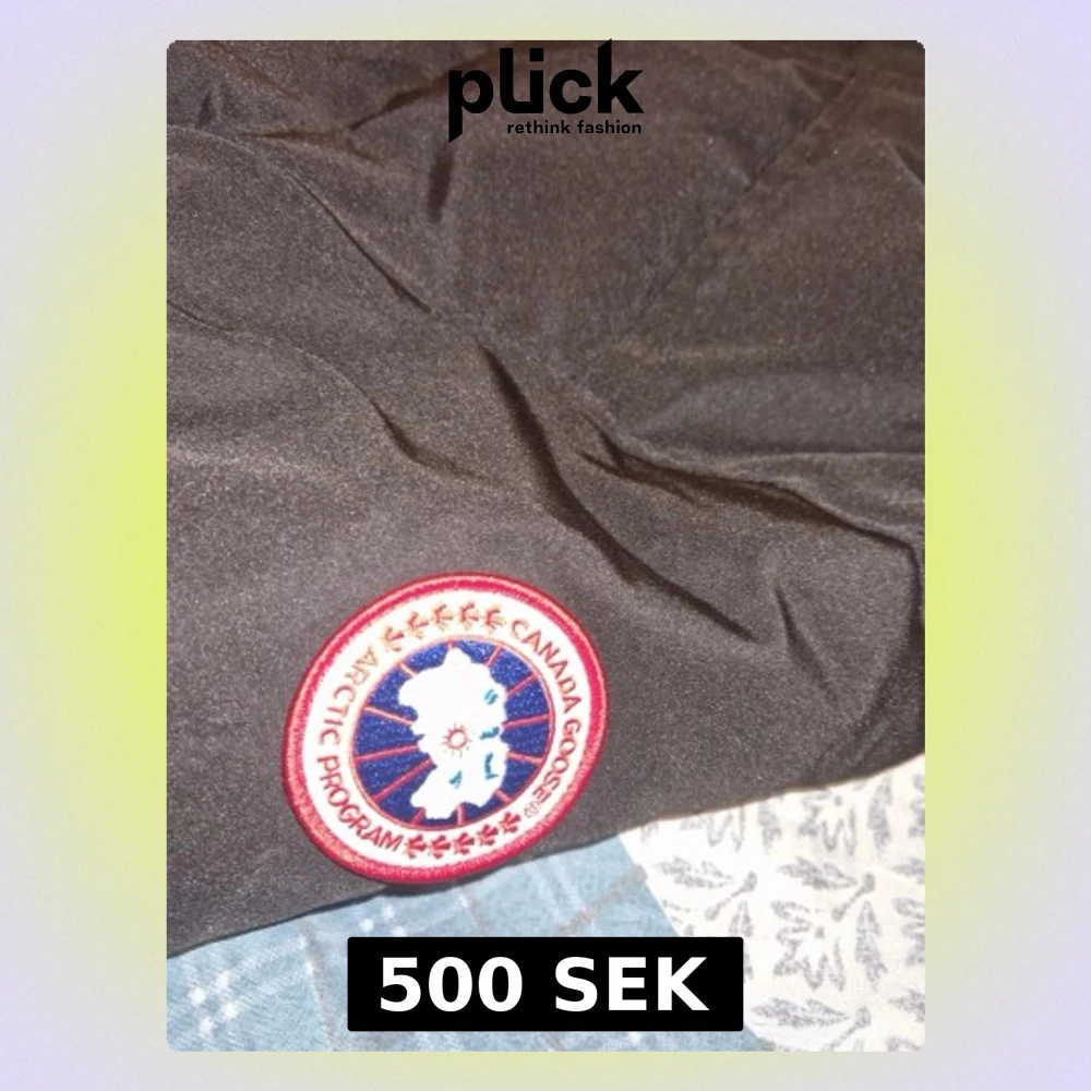 Svart pufferjacka från Canada Goose med huva och klassisk logga på ärmen. Jackan har dragkedja och knappar framtill, två stora fickor och quiltad design. Materialet är polyester och dun, perfekt för kalla dagar. Snygg och funktionell för dig som vill ha värme och stil. Jackan släpper ganska mycket fjädrar på insidan och är lite sönder på högersidan.