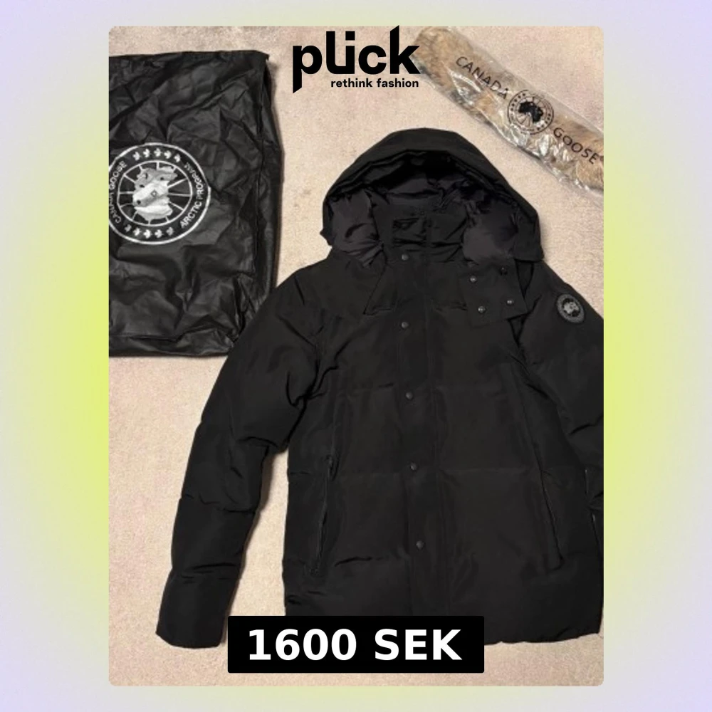 Säljer en svart vinterjacka från Canada Goose med huva och svart logotyp på ärmen. Storleken är L men passar perfekt till M.
