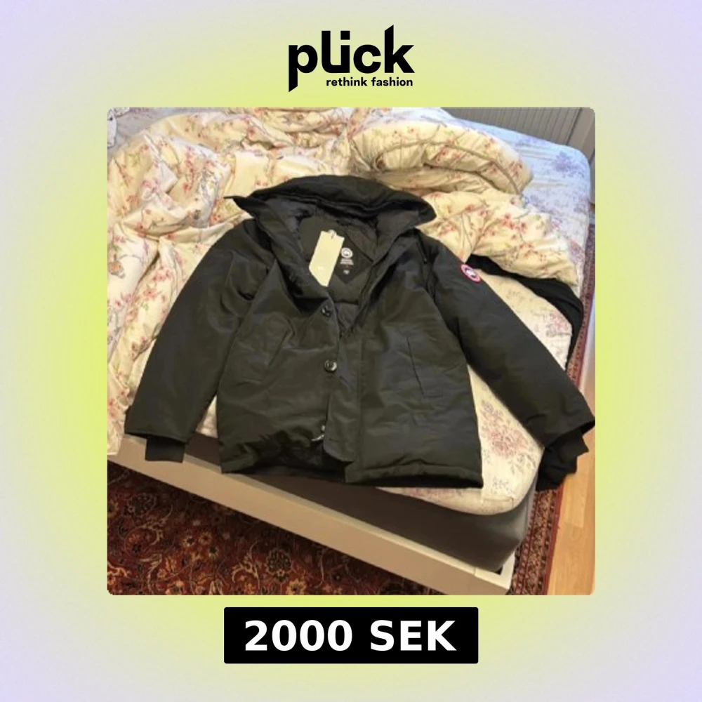 Canada Goose dunjacka i svart med huva och klassisk logga på ärmen. Jackan har både dragkedja och knappar framtill, två stora fickor och en clean, stilren look. Perfekt för kalla dagar och har en schysst oversized passform. Priset går att diskutera som allt annat på min profil 👍😊