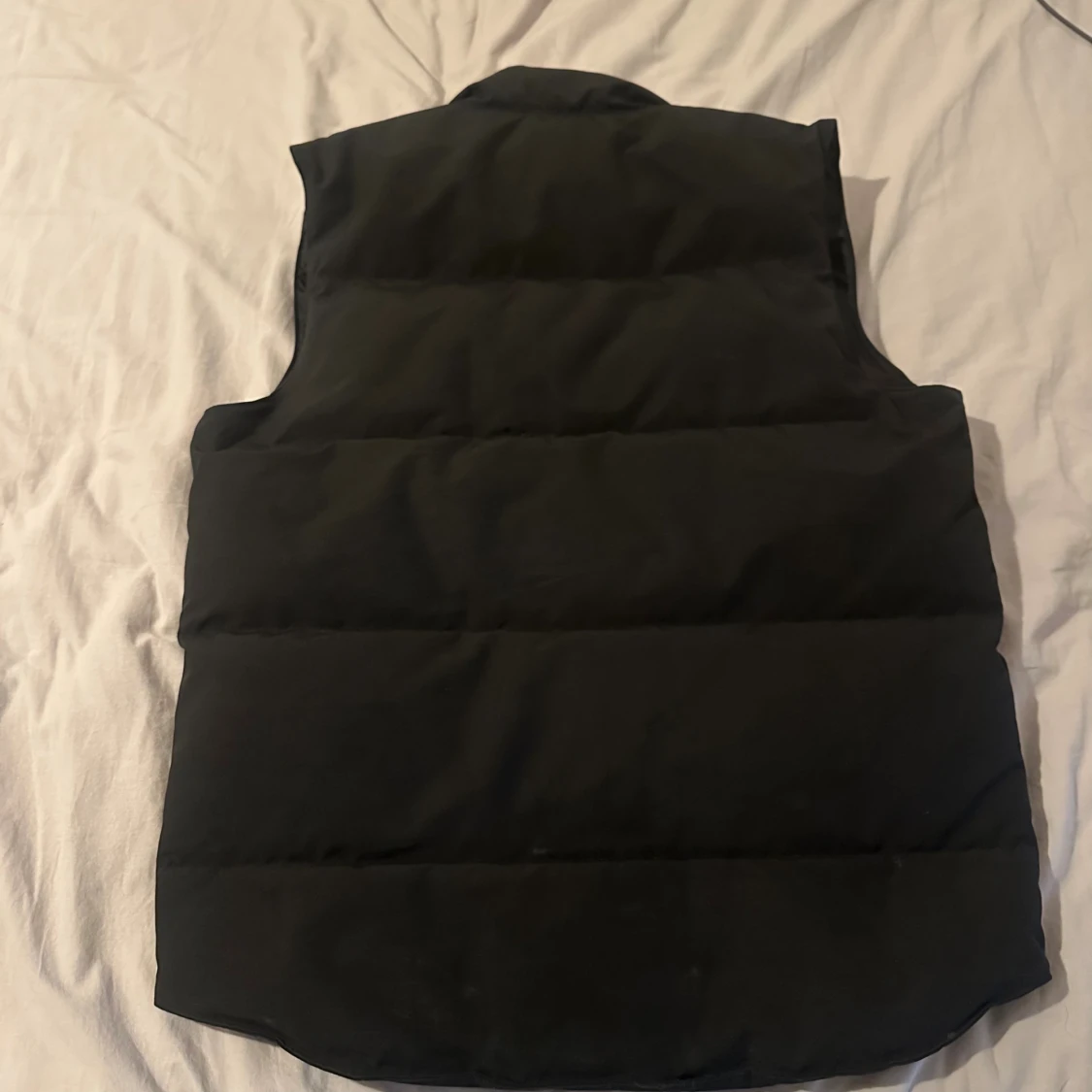 Svart dunväst från Canada Goose med klassisk logga på bröstet. Västen har hög krage, två stora fickor framtill och stängs med både dragkedja och knappar. Perfekt för lager-på-lager och riktigt snygg till streetwear. Original pris ca 8000kr
