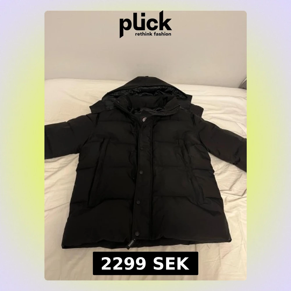 Säljer en svart pufferjacka från Canada Goose med huva och snygga detaljer. Jackan har dragkedja och knappar framtill, två stora fickor och en klassisk logga på insidan. Perfekt för kalla vinterdagar och riktigt stilren look.