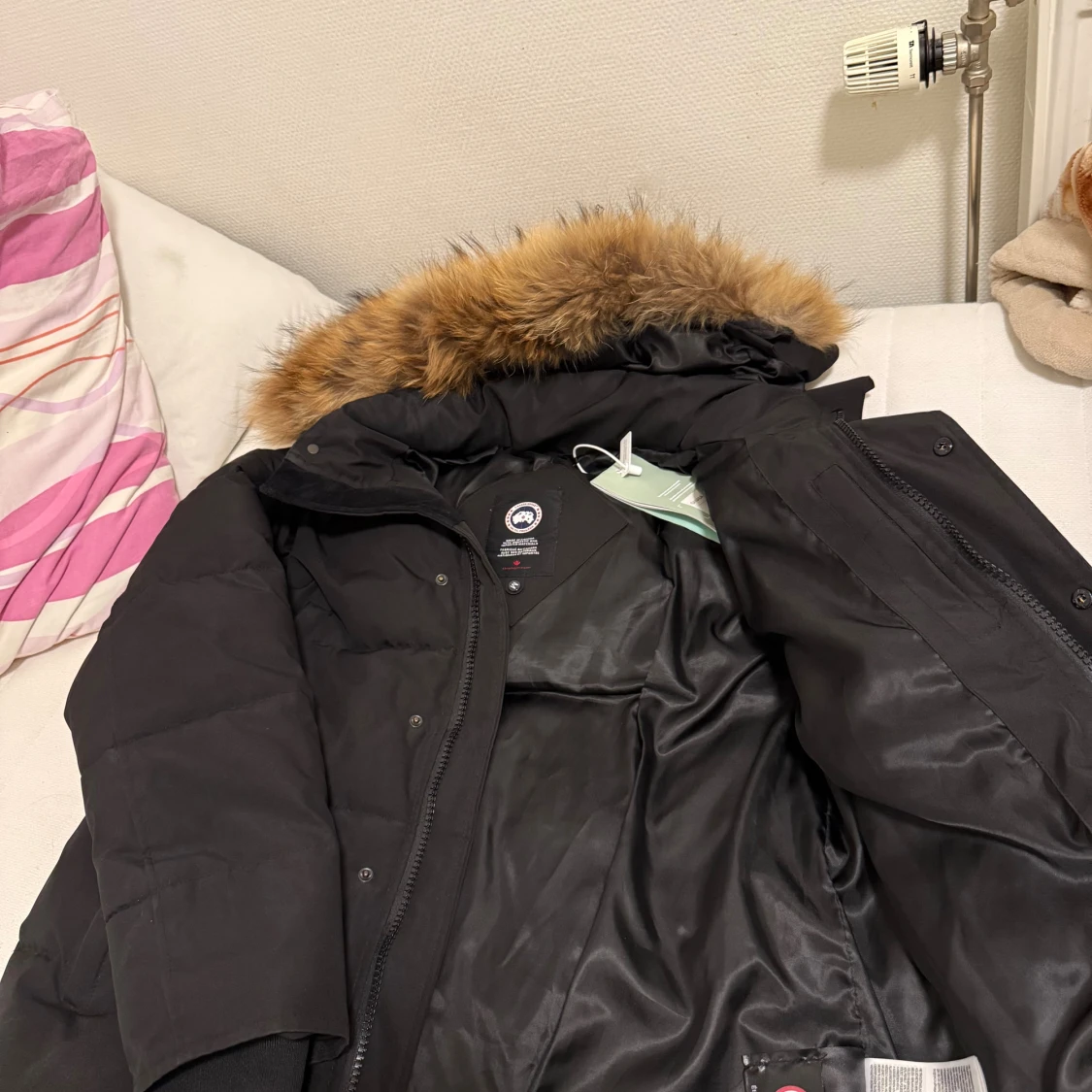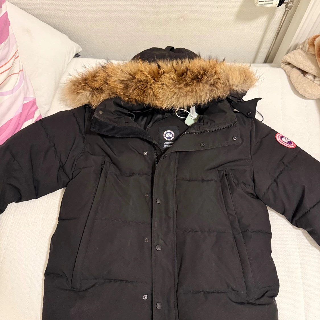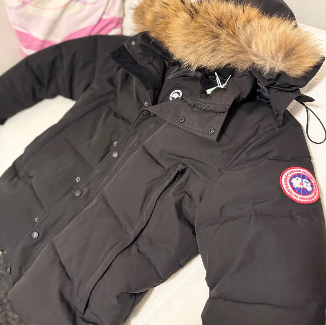 Säljer en svart dunjacka från Canada Goose med ikonisk patch på ärmen och stor huva med äkta päls. Jackan har dragkedja och knappar framtill, flera fickor och är perfekt för kalla vinterdagar. Klassisk pufferstil och riktigt varm.