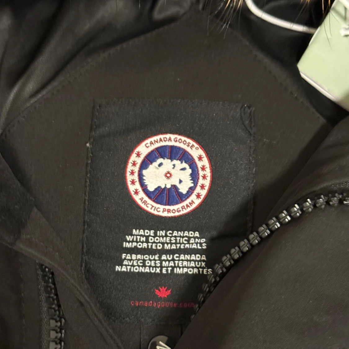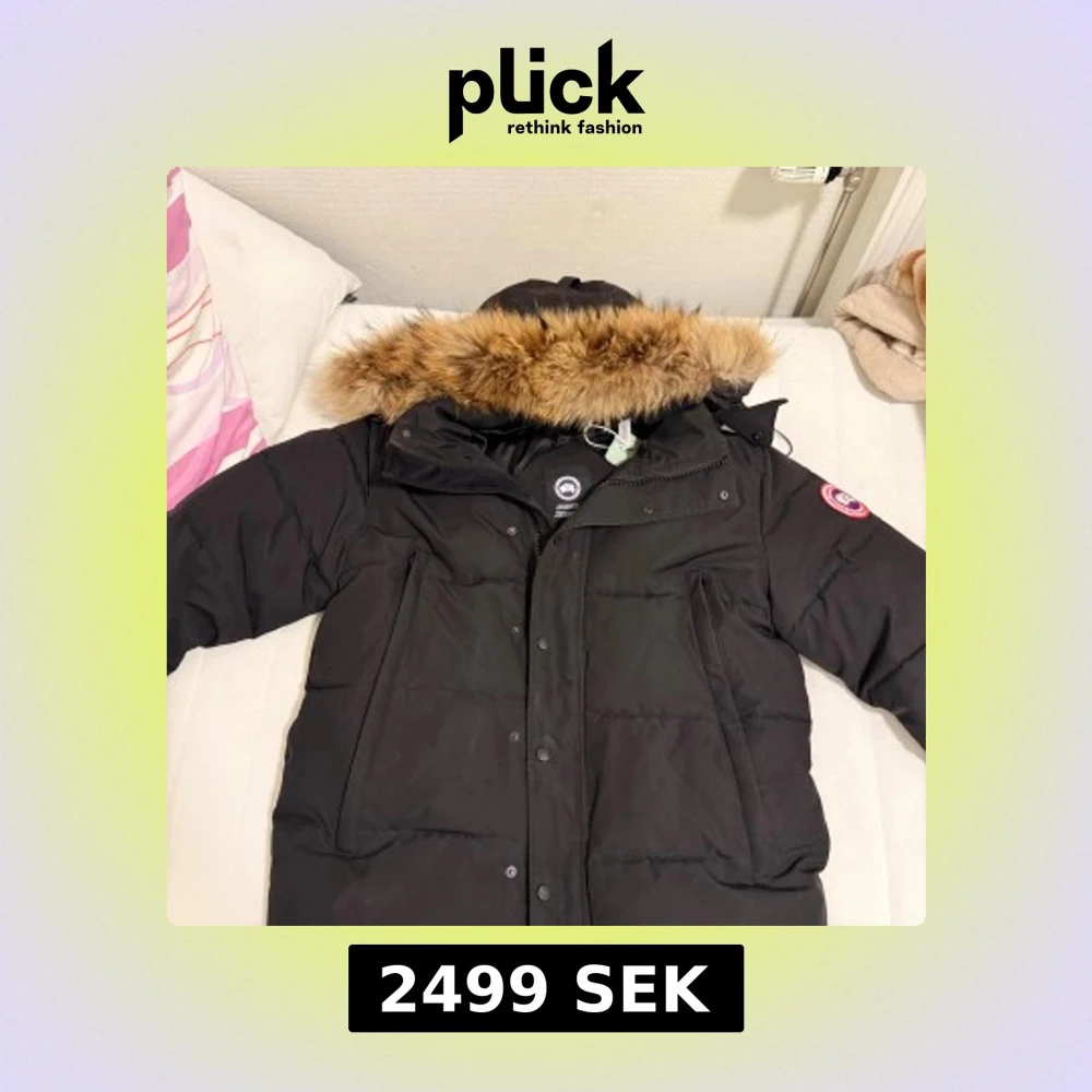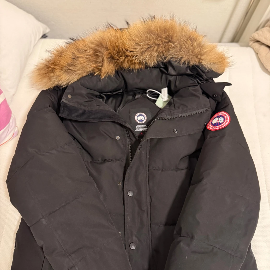 Säljer en svart dunjacka från Canada Goose med ikonisk patch på ärmen och stor huva med äkta päls. Jackan har dragkedja och knappar framtill, flera fickor och är perfekt för kalla vinterdagar. Klassisk pufferstil och riktigt varm.