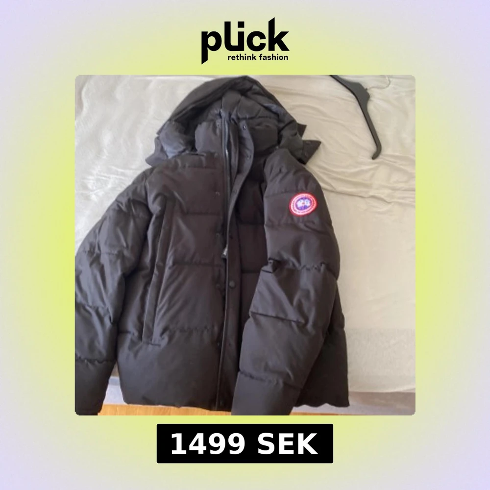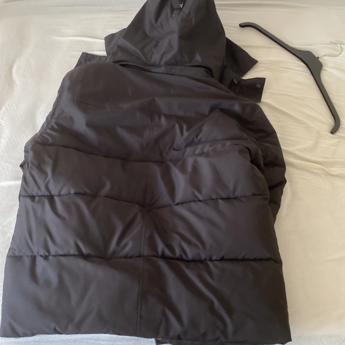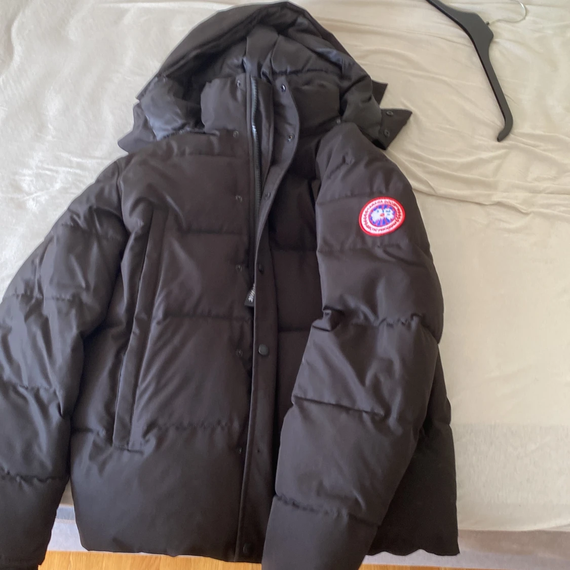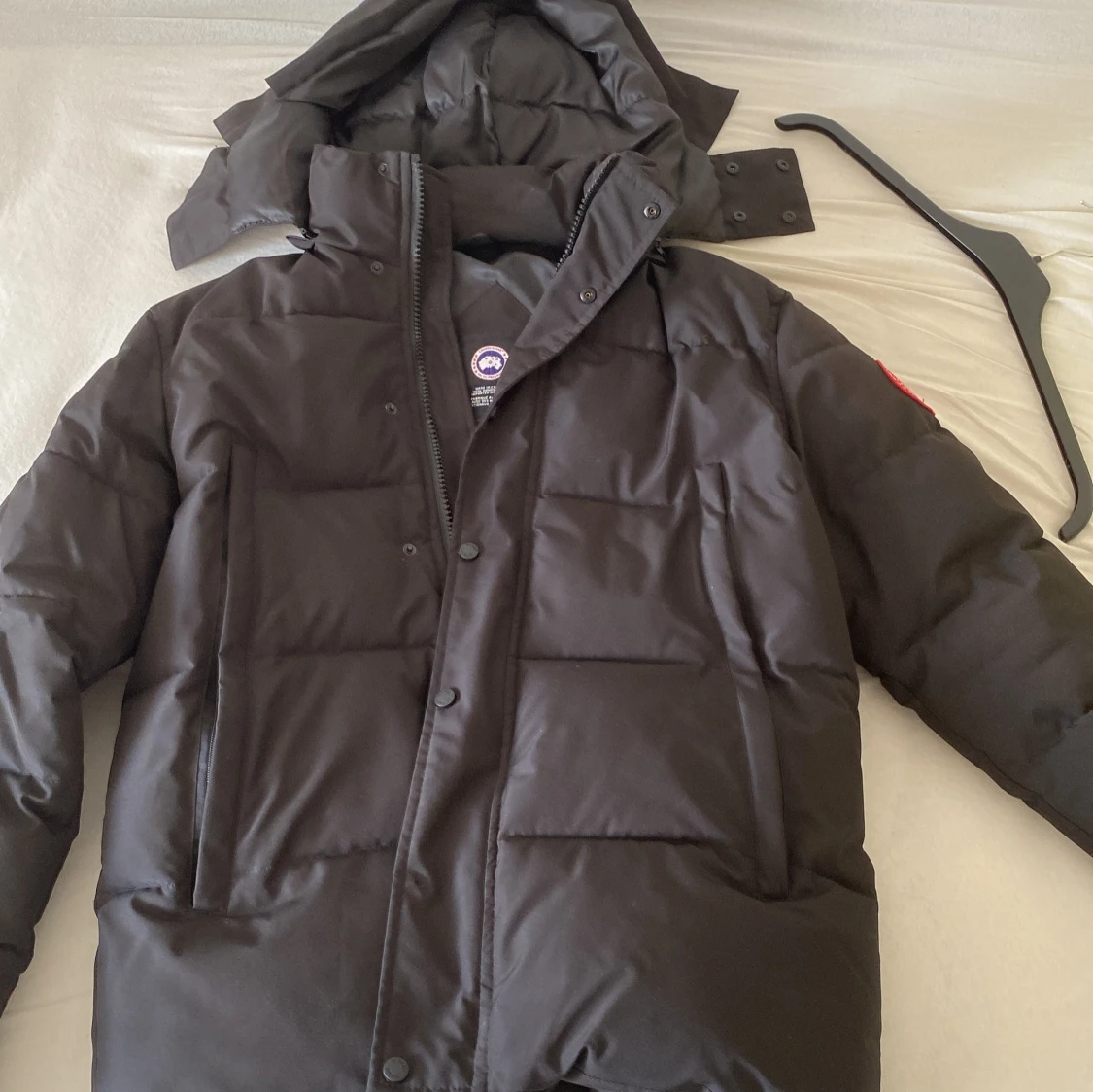 Säljer en svart dunjacka från Canada Goose med huva och klassisk logga på ärmen. Jackan har quiltad design, dragkedja och knappar framtill samt två stora fickor. Perfekt för kalla dagar och har en clean, stilren look. En knap har ramlat av, pris kan diskuteras