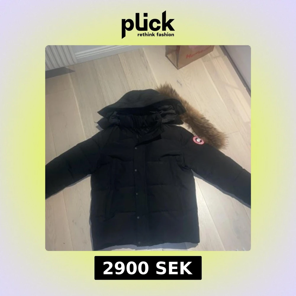 Säljer en svart dunjacka från Canada Goose med pälskantad huva. Jackan har en broderad logotyp på ärmen och stängs med dragkedja och knappar. Perfekt för kalla vinterdagar.