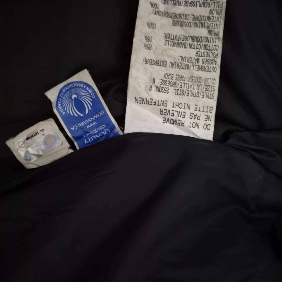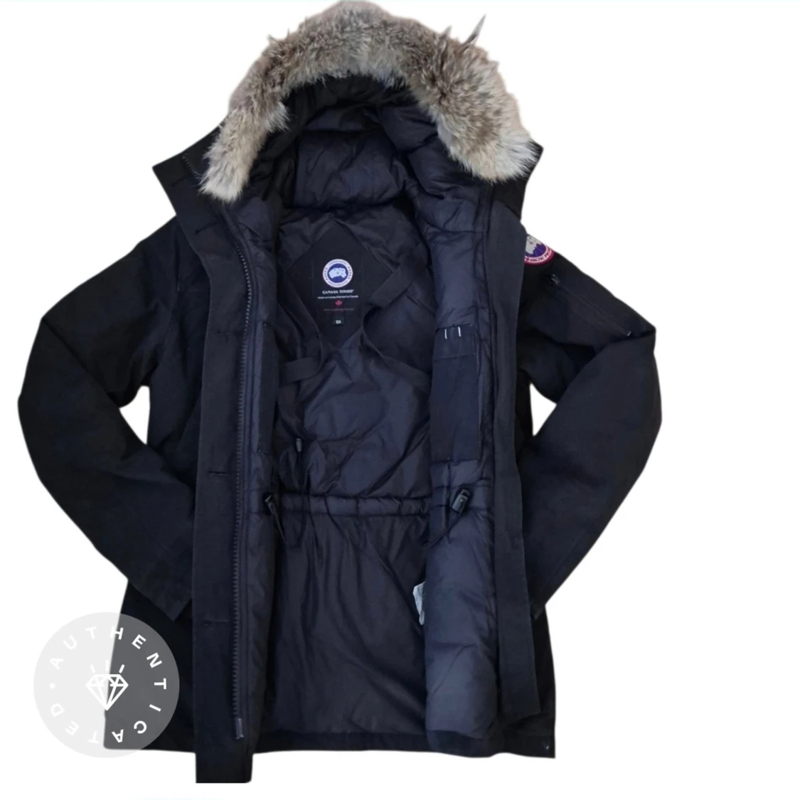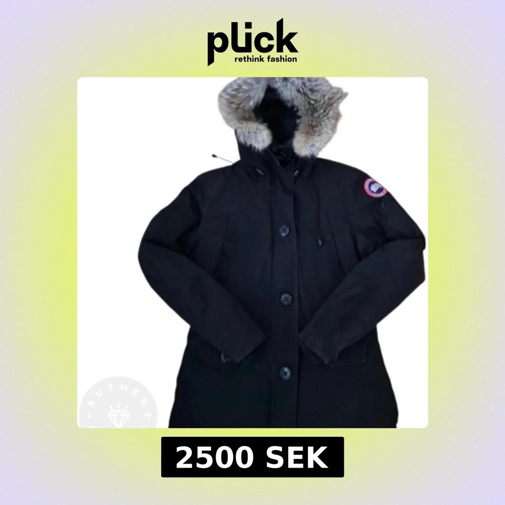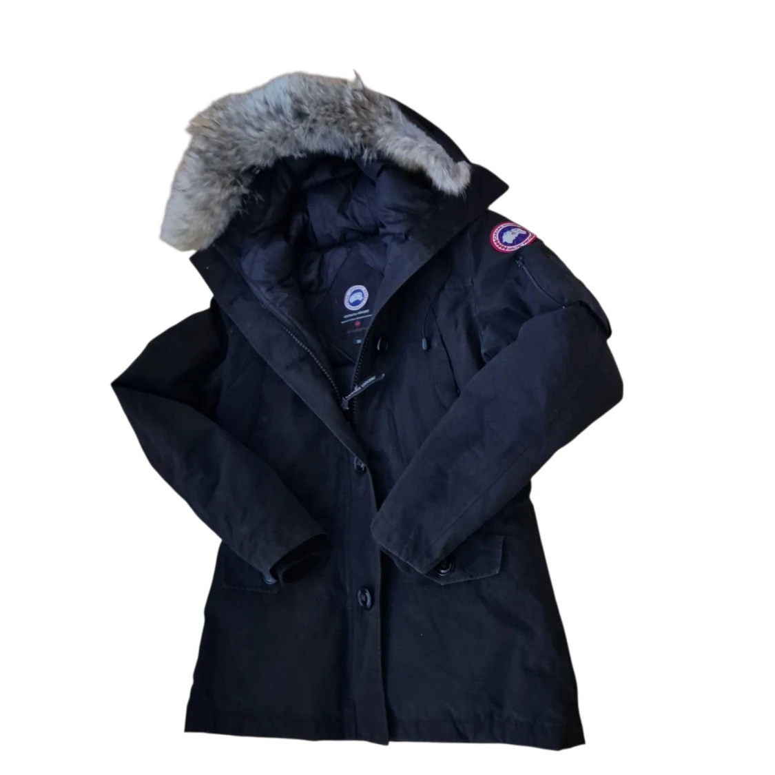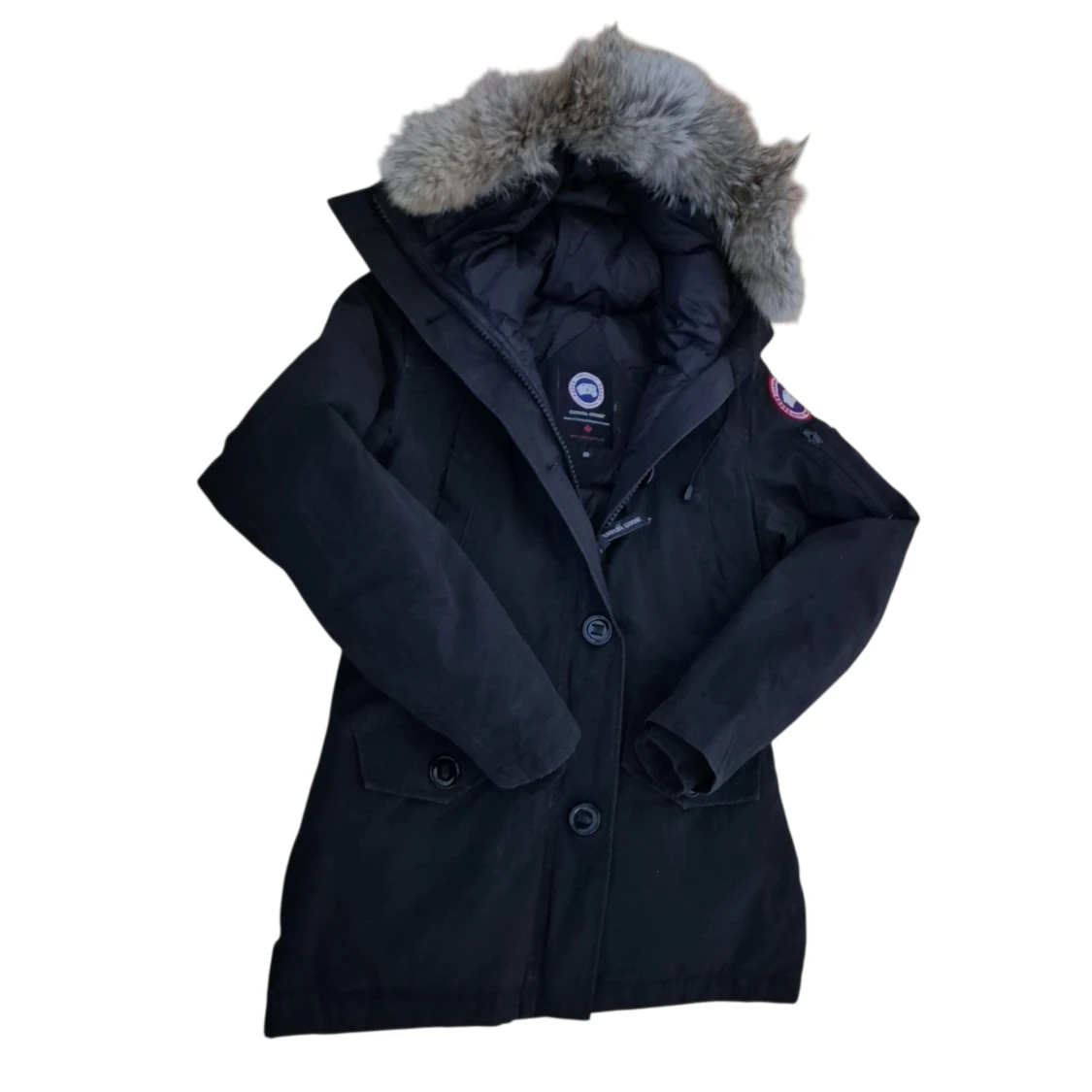 Svart parkas från Canada Goose med dunfoder och stor huva med päls. Jackan har klassisk logga på ärmen, knappar och dragkedja framtill samt stora fickor. Perfekt för kalla vinterdagar och riktigt snygg siluett.
