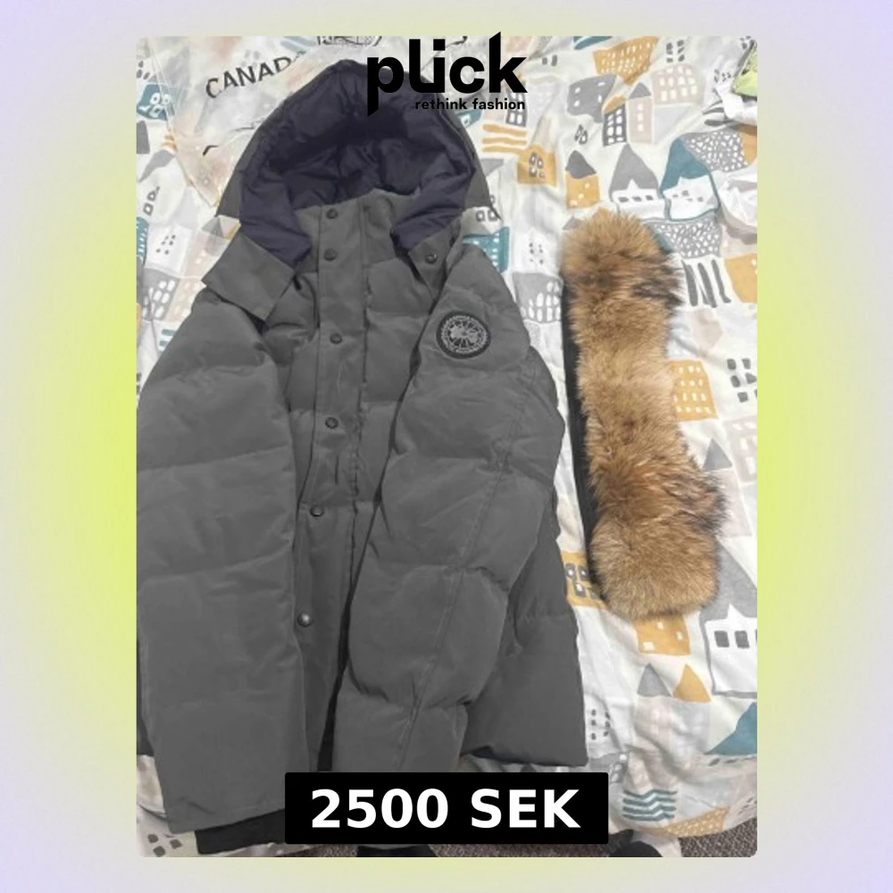Säljer en mörkgrå dunjacka från Canada Goose med stor huva och avtagbar pälsdetalj. Jackan har knappar framtill, ribbade muddar och klassisk logga på ärmen. Perfekt för kalla dagar och riktigt snygg streetstil.