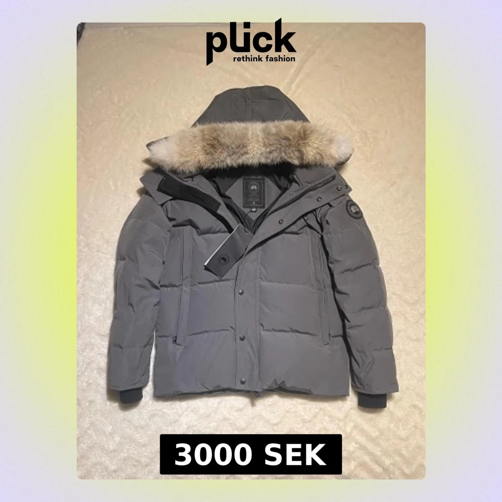 Säljer en grå Canada Goose Wyndham med avtagbar huva och pälskant. Jackan har svart logotyp på ärmen, dragkedja och knappar framtill samt ribbade muddar. Perfekt för kalla vinterdagar och riktigt snygg passform.