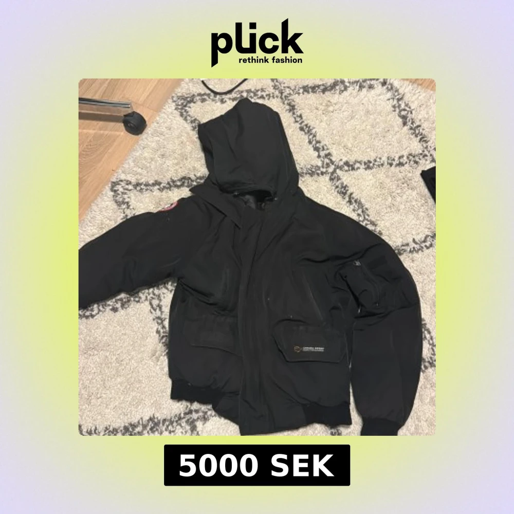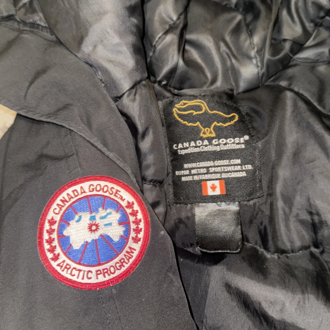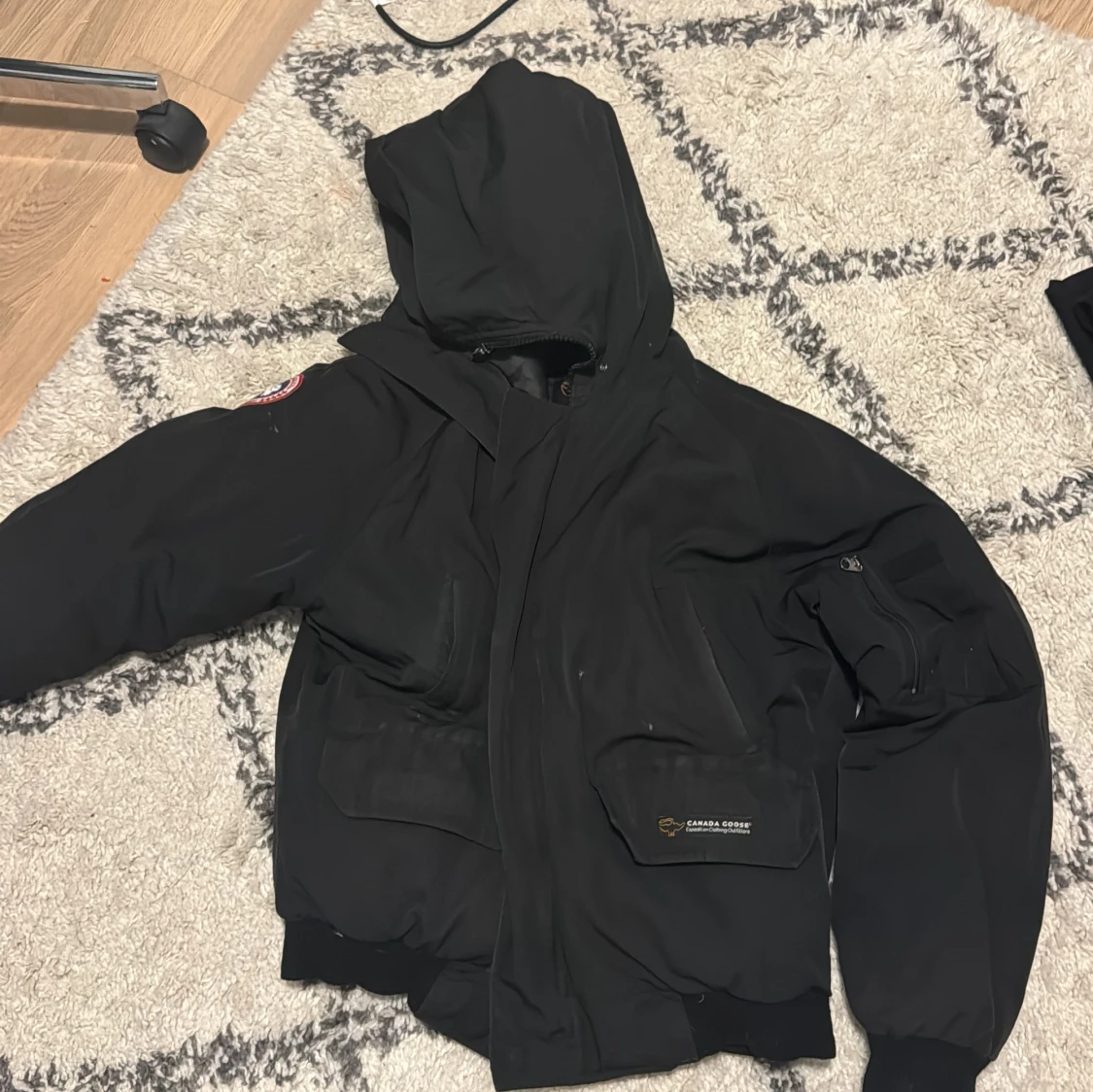 Säljer en svart dunjacka från Canada Goose med huva och dragkedja. Jackan har en broderad logotyp på ärmen och flera praktiska fickor. Perfekt för kalla dagar.