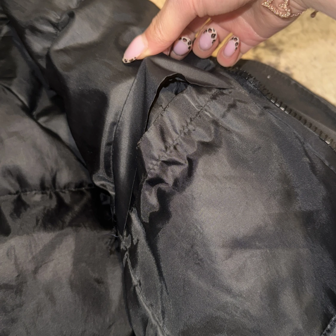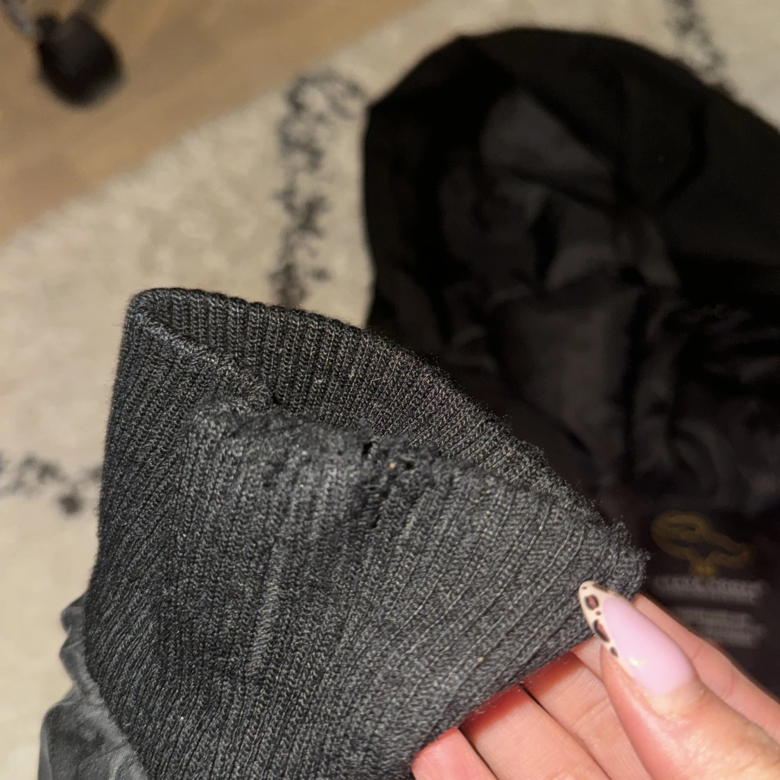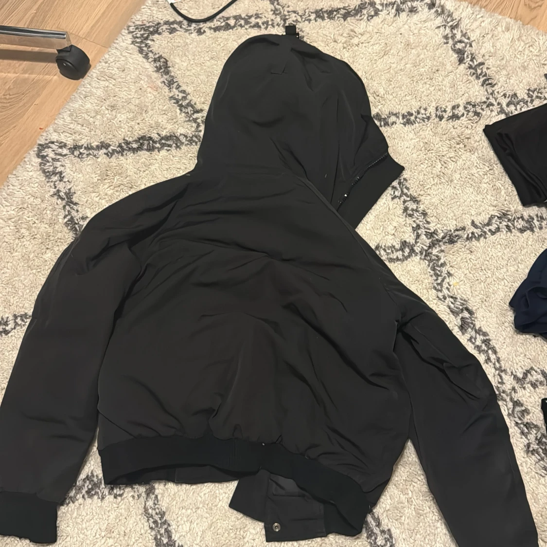 Säljer en svart dunjacka från Canada Goose med huva och dragkedja. Jackan har en broderad logotyp på ärmen och flera praktiska fickor. Perfekt för kalla dagar.