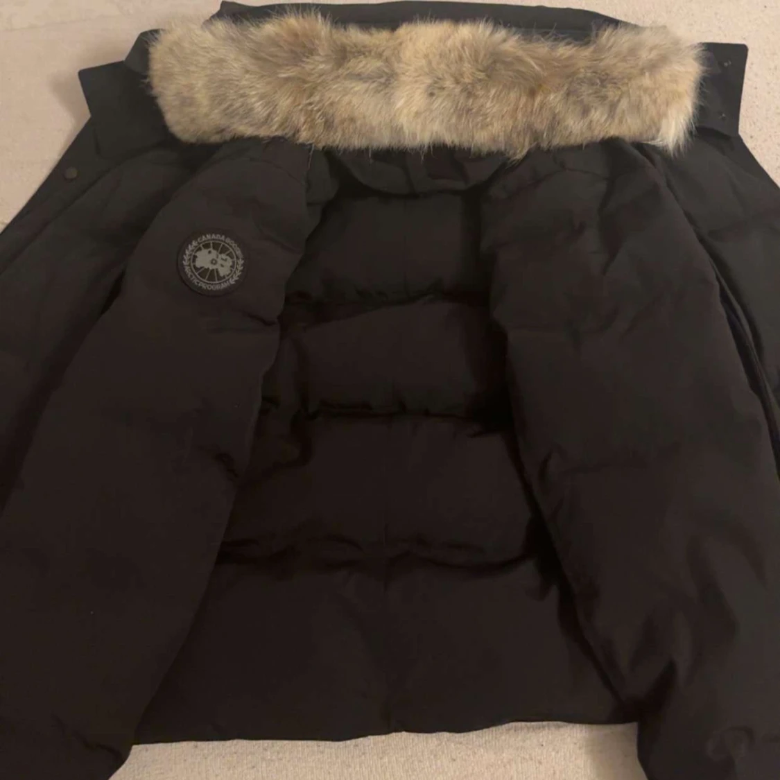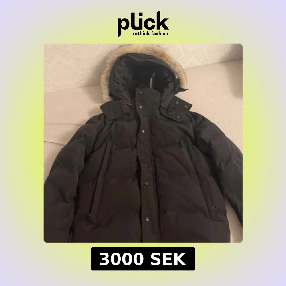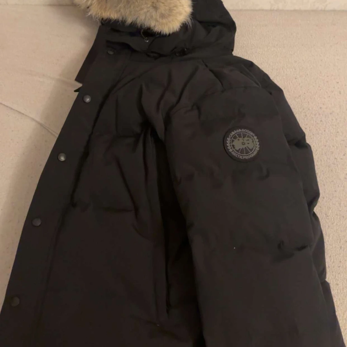 Säljer en svart dunjacka från Canada Goose med huva och snygg fuskpäls runt kanten. Jackan har långa ärmar, flera fickor och tydlig logga på ärmen. Perfekt för kalla dagar när du vill hålla dig varm och ändå se stilren ut. Päls ingår självklart och det är storlek M