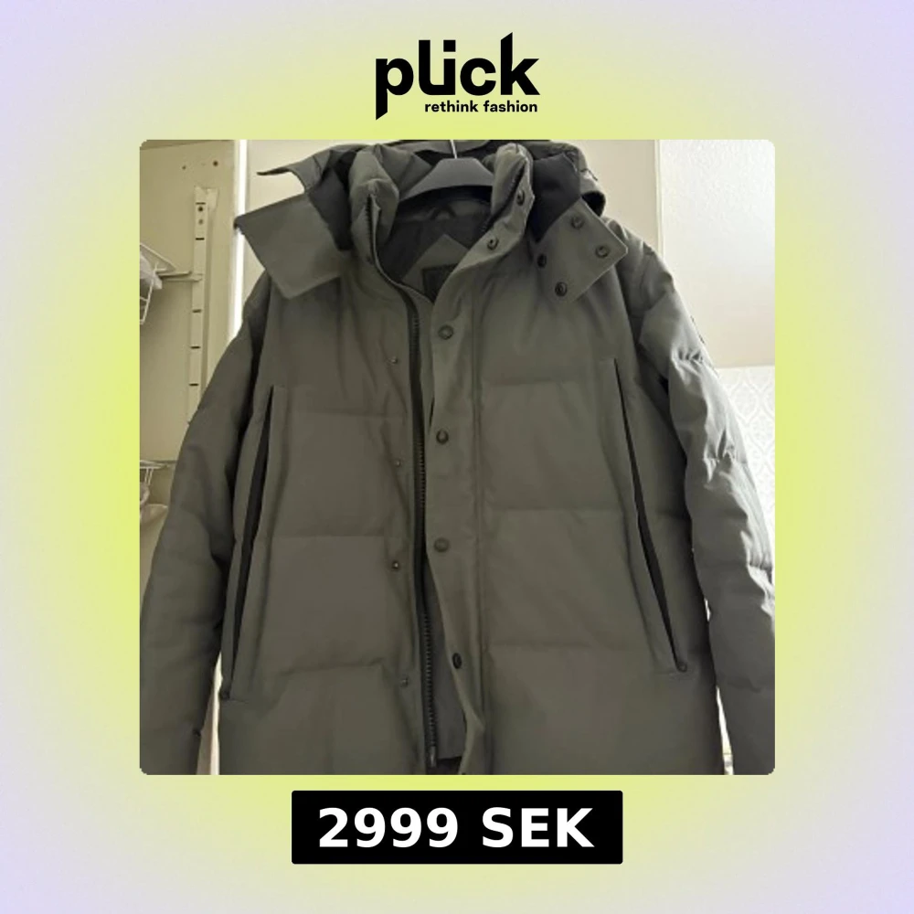Säljer en grå dunjacka från Canada Goose i storlek M. Jackan har huva, svarta dragkedjor på fickorna och knappar framtill. Klassisk patch på ärmen och quiltad design. Perfekt för kalla dagar med stilren look.