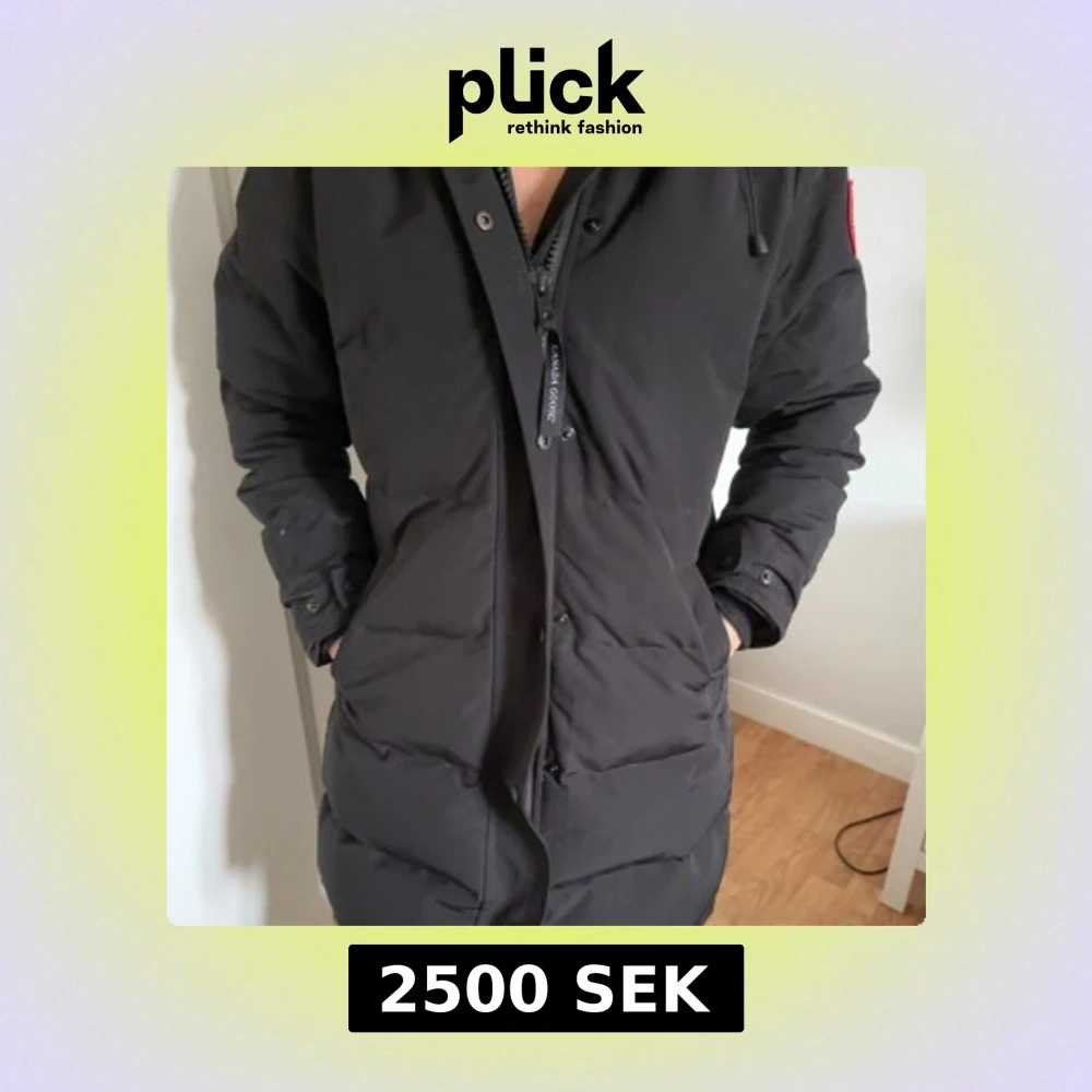 Säljer en svart dunjacka från Canada Goose med en lyxig pälsfodrad huva. Jackan har en lång passform och är perfekt för kalla vinterdagar. Den har en dragkedja framtill och långa ärmar med muddar. Märkets logga syns på ärmen. storlek M