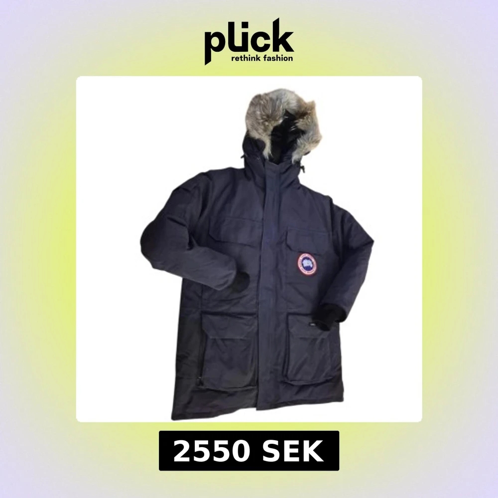 Säljer en mörkblå dunparkas från Canada Goose med stor huva och snygg fuskpäls. Jackan har flera stora fickor framtill, klassisk logga på bröstet och quiltad insida. Perfekt för kalla vinterdagar och riktigt stilren look.