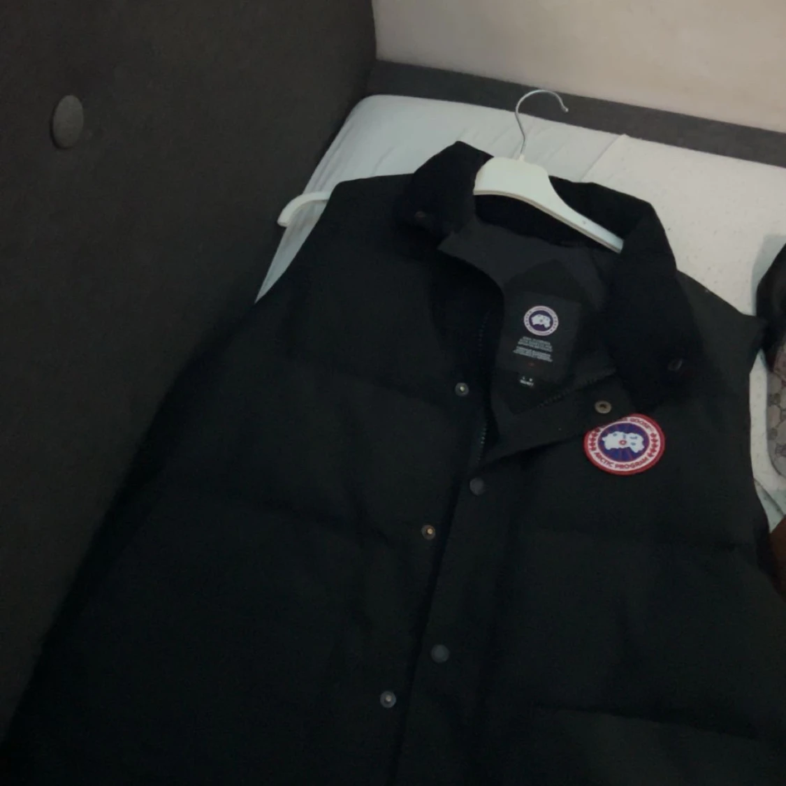 Säljer en svart dunväst från Canada Goose med klassisk logotyp på bröstet. Västen har hög krage, knappar och dragkedja framtill. Perfekt för lager-på-lager under kyliga dagar.