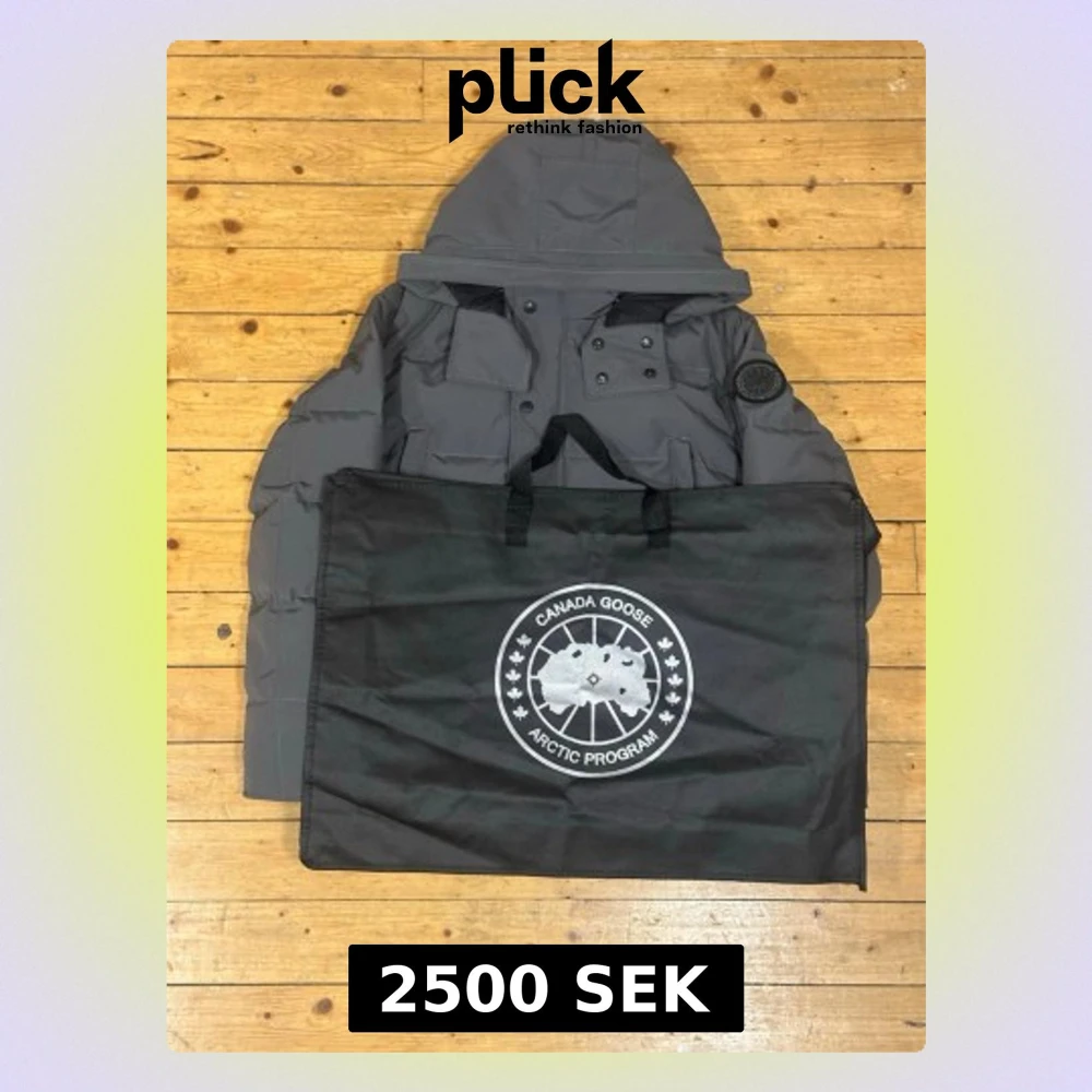 Säljer en mörkgrå dunjacka från Canada Goose med huva och flera praktiska fickor. Jackan har en stilren look med svarta detaljer, patch på ärmen och stängs med både dragkedja och knappar. Perfekt för kalla dagar och riktigt varm.