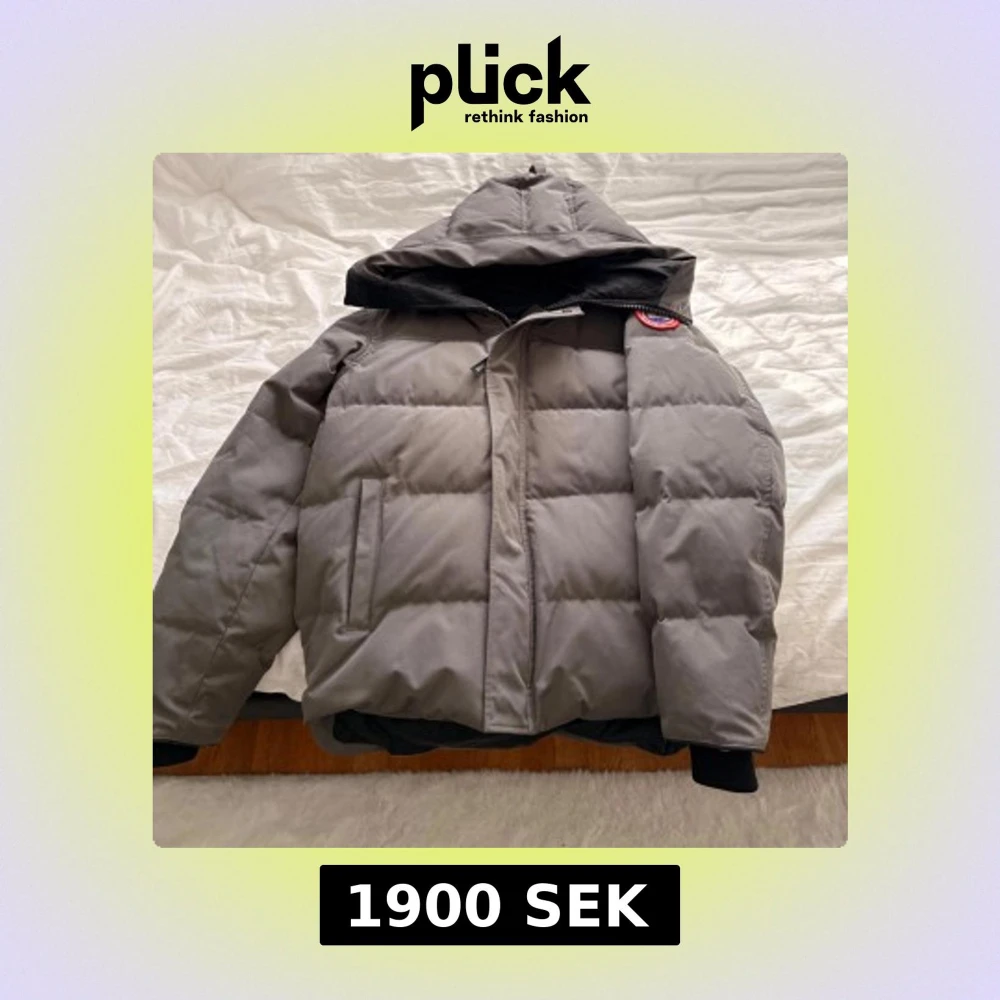 Säljer en grå dunjacka från Canada Goose med huva och klassisk patch på axeln. Jackan är quiltad, har dragkedja och två sidofickor. Perfekt för kalla dagar och har en clean, stilren look som funkar till det mesta. Finns små fläckar på jackan därför är priset ej hugget i sten