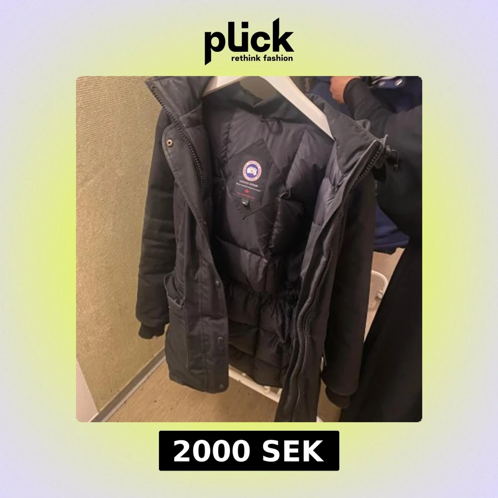 Säljer en svart dunjacka från Canada Goose med klassisk logga på ärmen. Jackan har huva, dragkedja och knappar framtill samt elastisk midja för snygg passform. Perfekt för kalla dagar och riktigt varm. Fodrad insida och flera praktiska fickor.