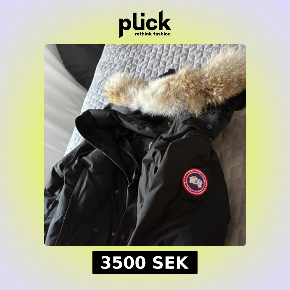 Svart dunjacka från Canada Goose med fluffig beige päls på huvan och klassisk logopatch på ärmen. Jackan har lång ärm, dragkedja och tryckknappar framtill. Perfekt för kalla vinterdagar och har en snygg, tidlös look.köpt förra vintern