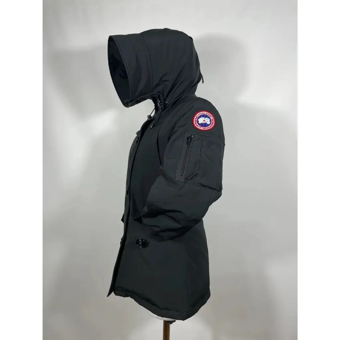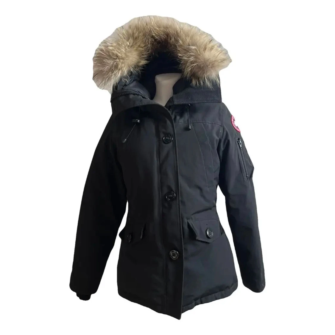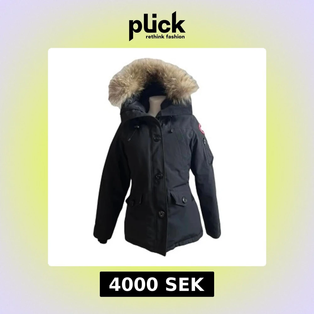 Snygg svart parkajacka från Canada Goose med avtagbar huva och pälsdetalj. Jackan har långa ärmar och flera praktiska fickor med knappar. Perfekt för kalla dagar.