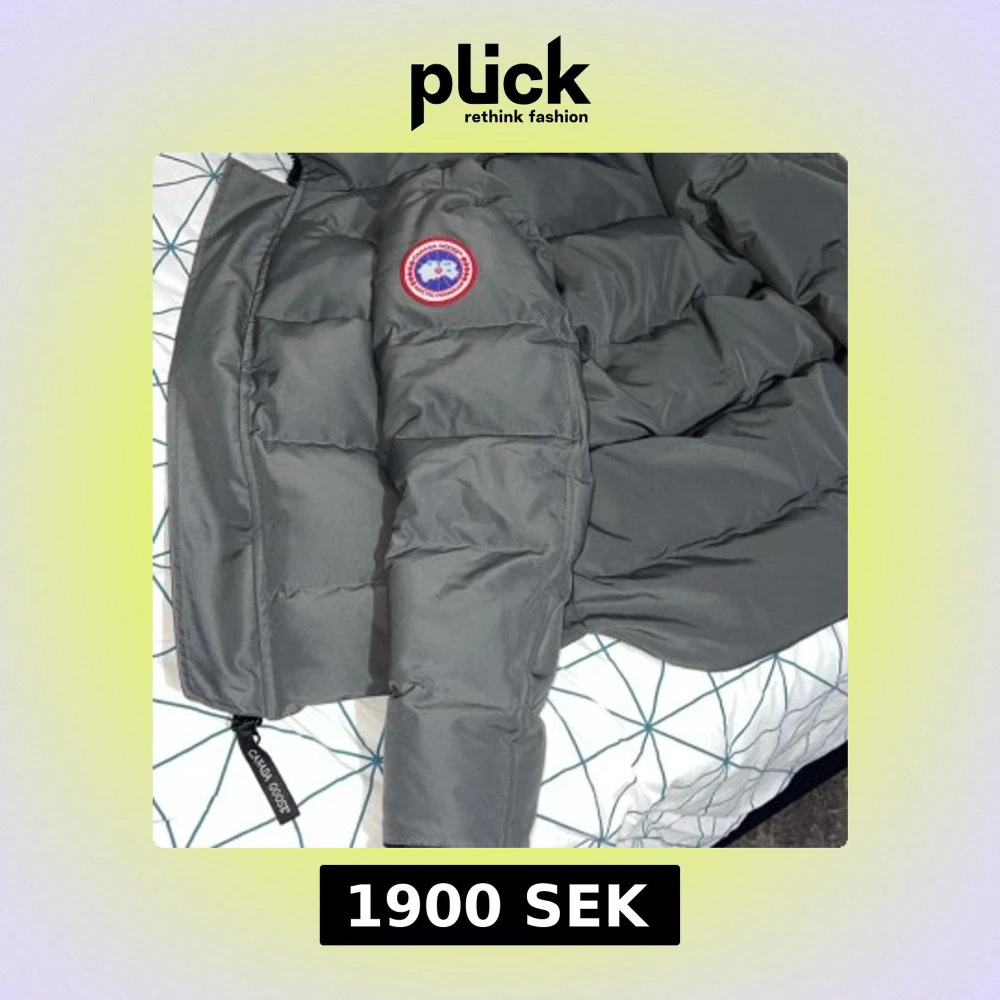 Säljer en stilren grå dunjacka från Canada Goose med deras ikoniska märke på ärmen. Jackan har en dragkedja framtill och är perfekt för kalla dagar. Den är långärmad och har en praktisk huva för extra värme.