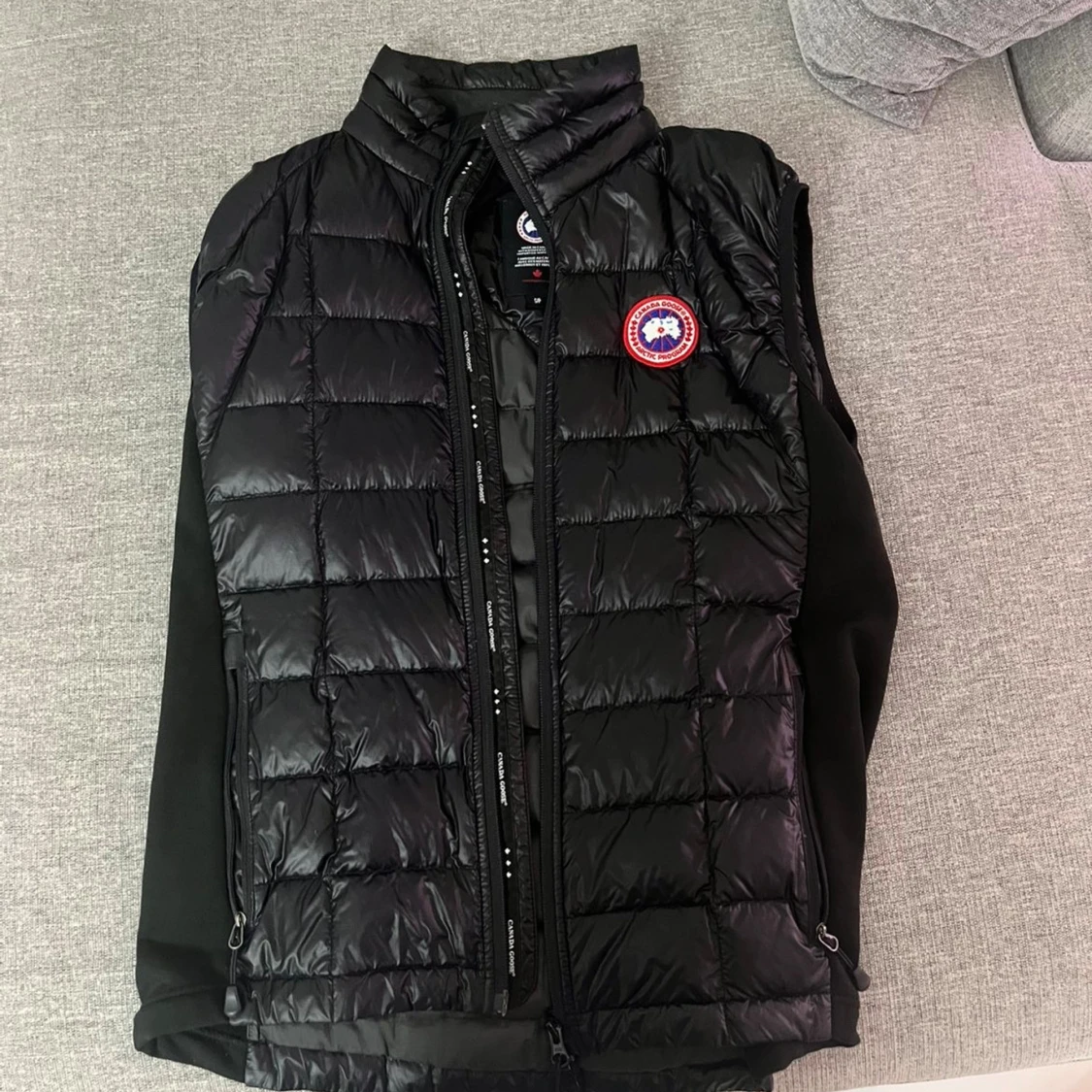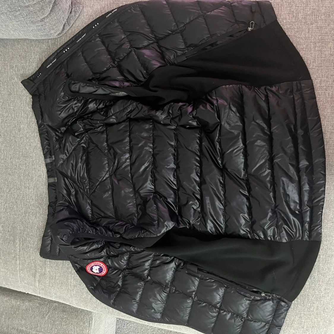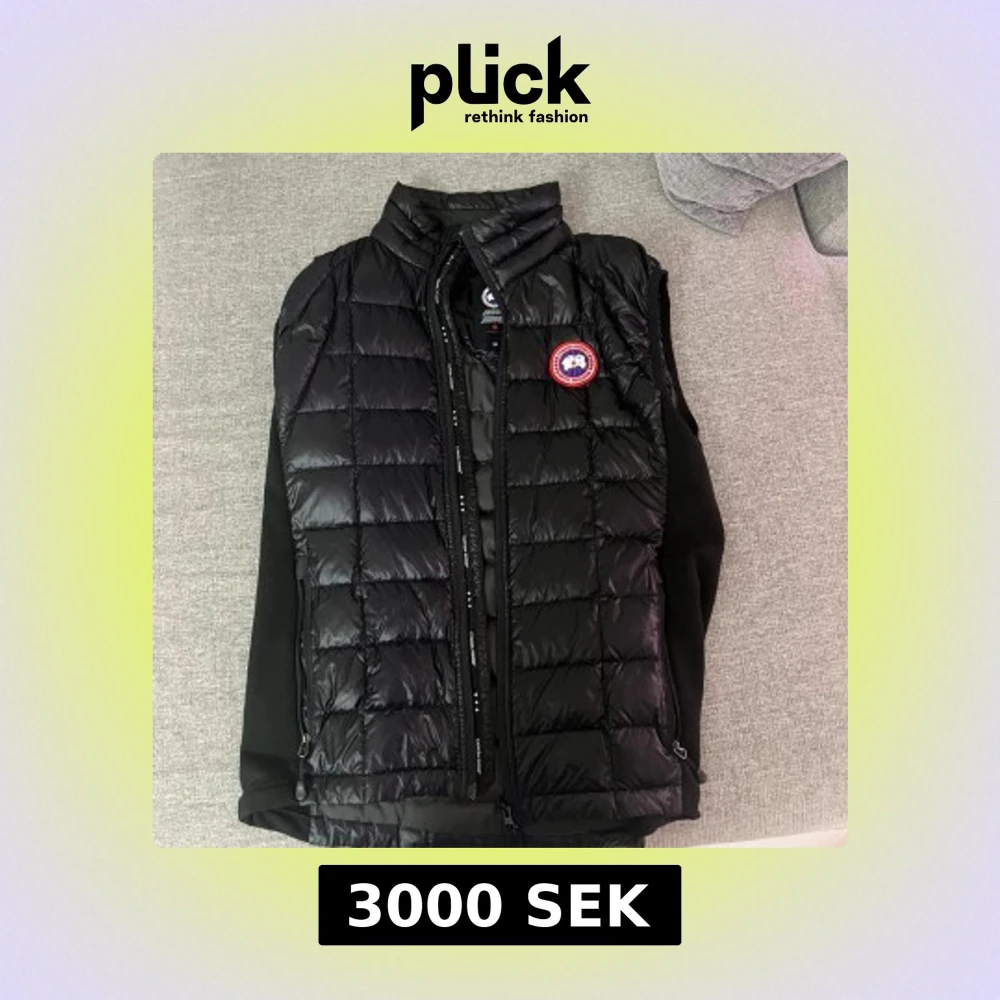 Svart quiltad dunväst från Canada Goose med klassisk logga på bröstet. Västen har hög krage, dragkedja framtill och sidopaneler i stretchigt material för extra komfort. Perfekt att slänga över en hoodie när det är kyligt ute.