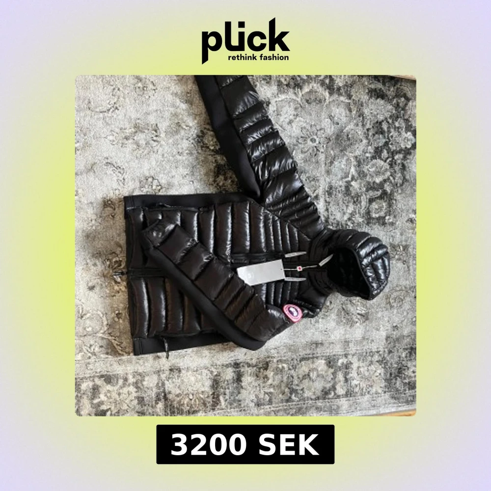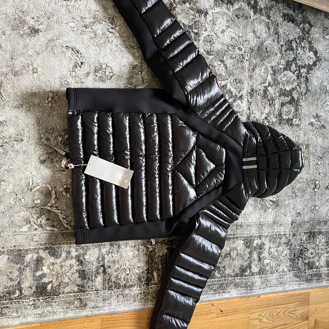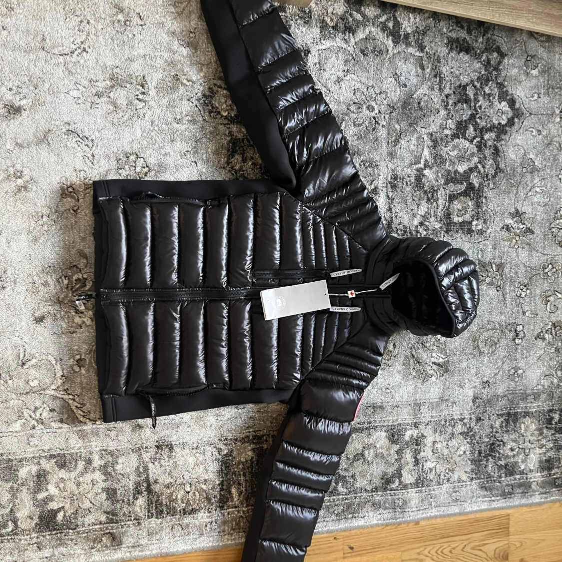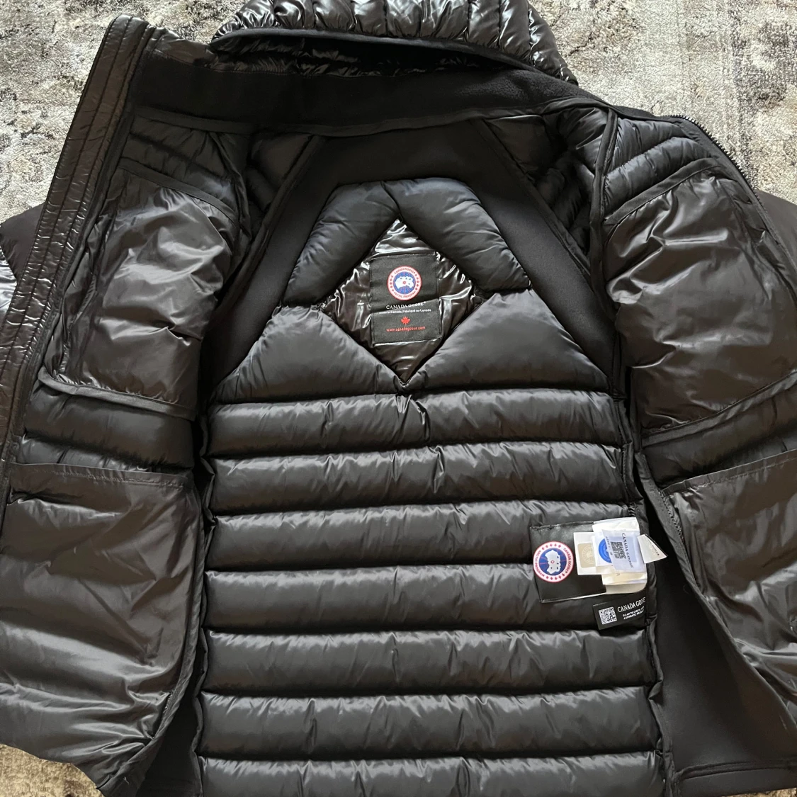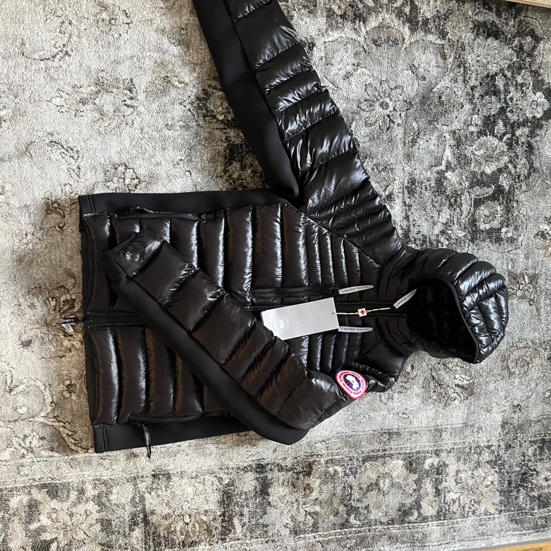 Snygg svart pufferjacka från Canada Goose med huva och dragkedja. Jackan har quiltad design, klassisk logga på ärmen och är tillverkad i glansigt material. Perfekt för kalla dagar och har en modern, sportig look.
