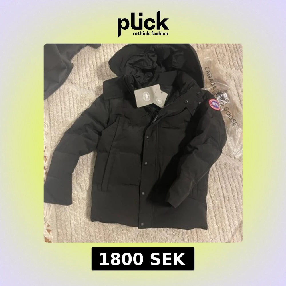 Säljer en svart dunjacka från Canada Goose med huva och klassisk logga på ärmen. Jackan är vadderad och har dragkedja samt knappar framtill. Medföljer originalpåse och avtagbar pälskant till huvan. Perfekt för kalla vinterdagar.