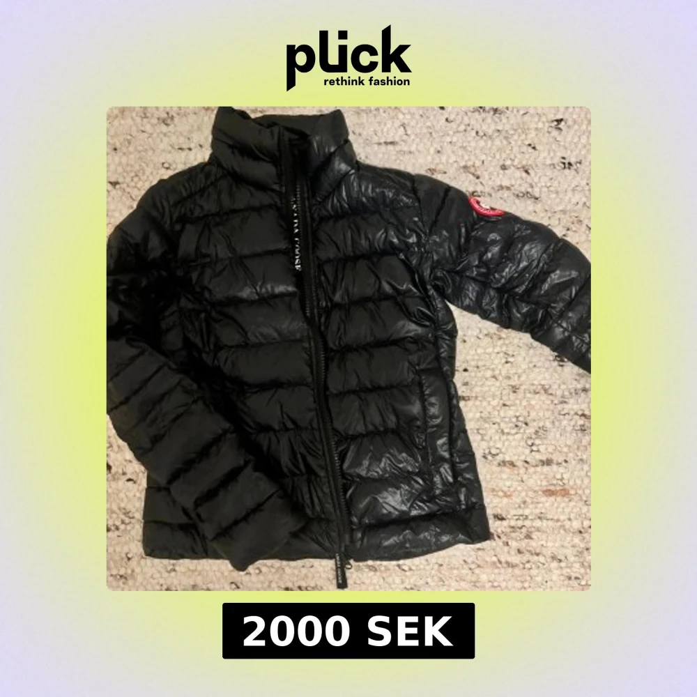 Säljer en svart dunjacka från Canada Goose med klassisk logga på ärmen. Jackan har quiltad design, hög krage och dragkedja framtill. Materialet är glansigt och lätt, perfekt för kalla dagar. Snygg och stilren modell som funkar till många olika outfits.