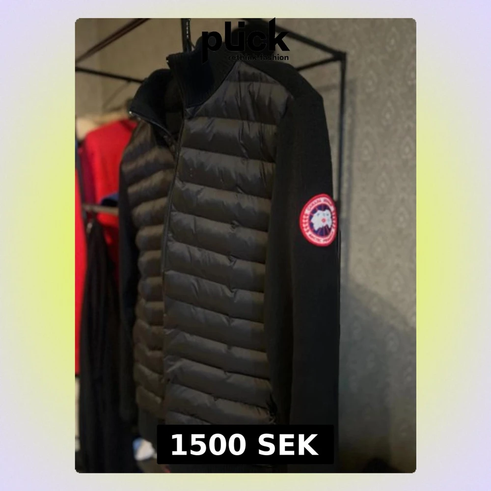 Säljer en svart HyBridge Knit Jacka från Canada Goose med quiltad front och stickade ärmar. Jackan har dragkedja, hög krage och den klassiska Canada Goose-loggan på ärmen. Materialmix av dun och stickad ull ger både värme och stil.