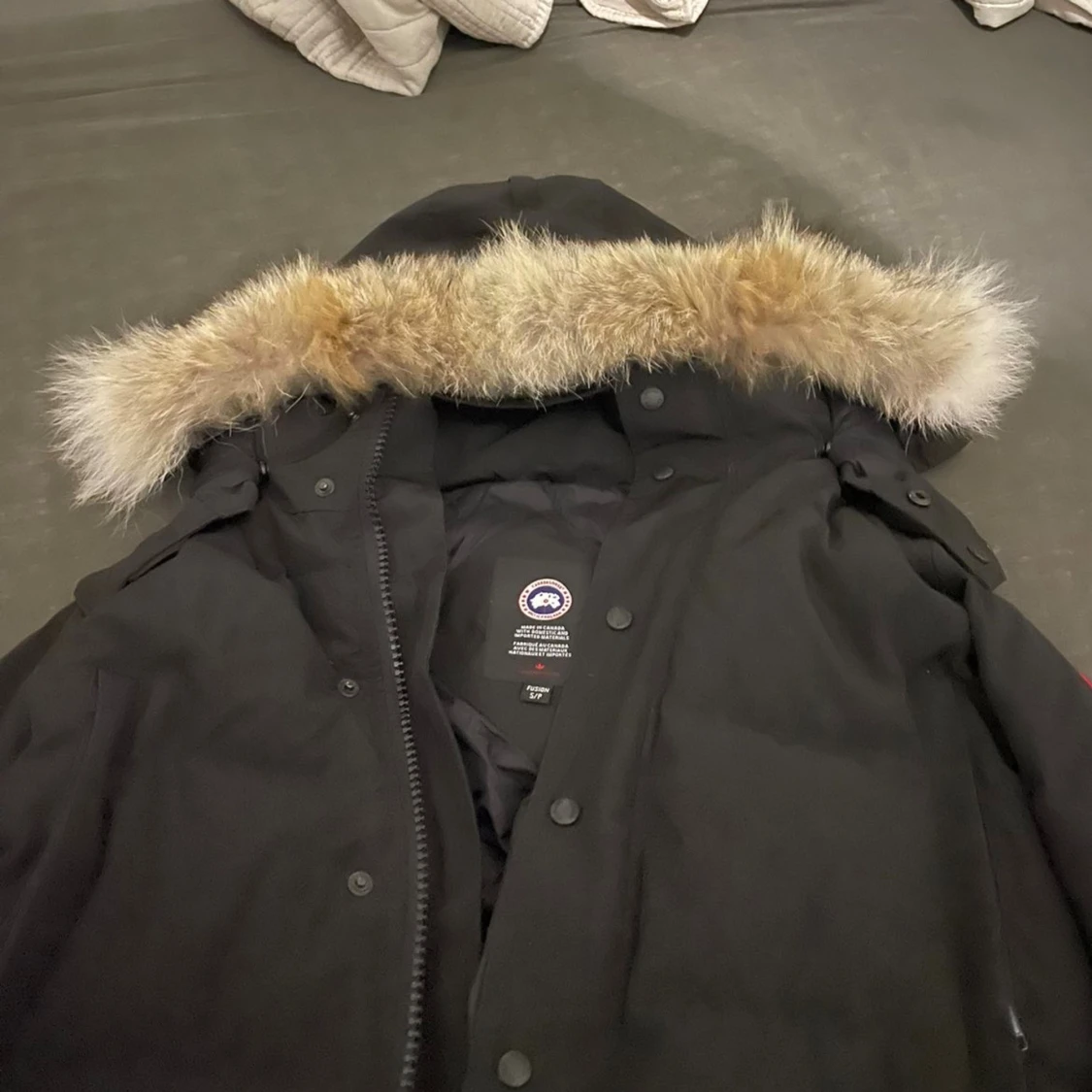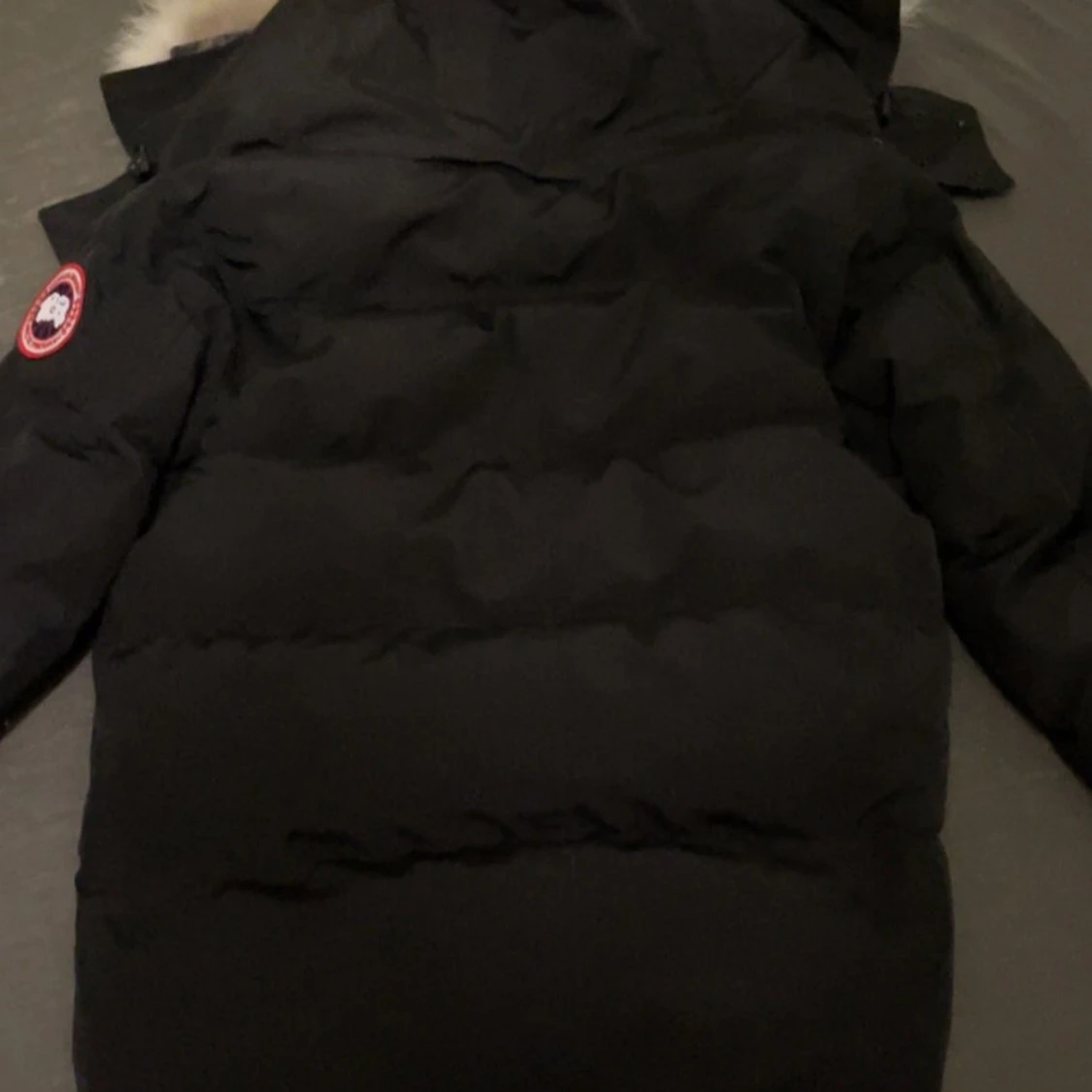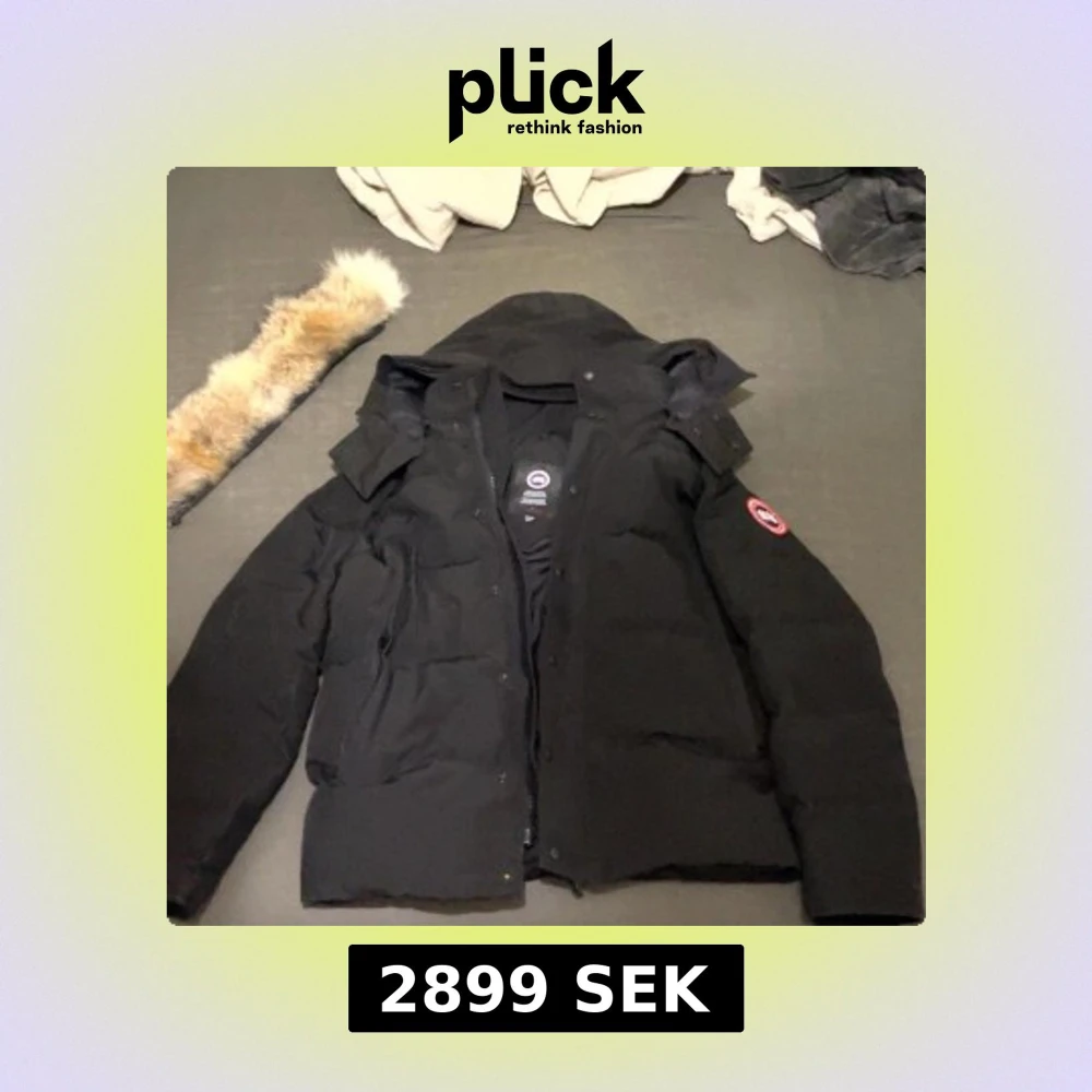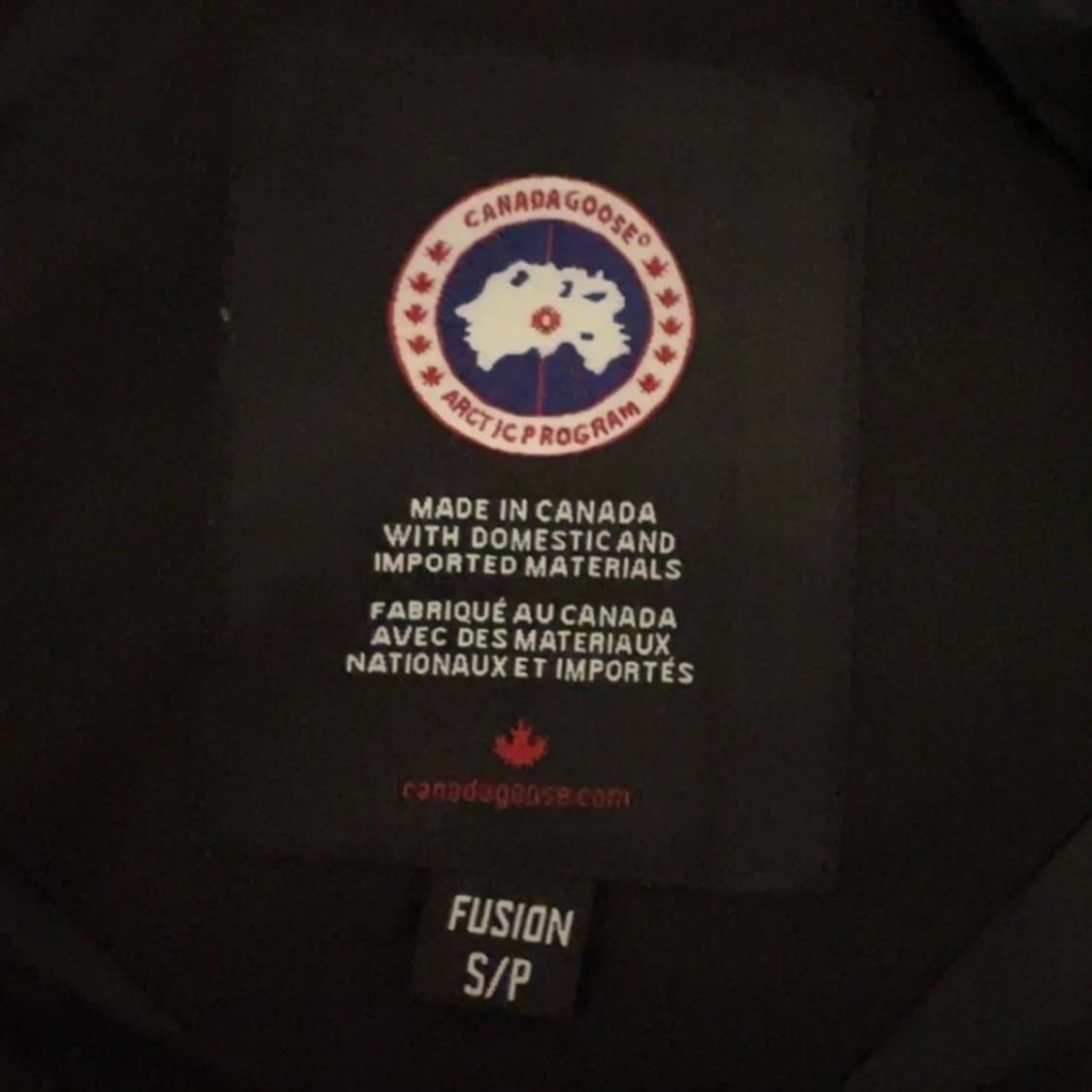 Säljer en svart Canada Goose dunjacka i modell Fusion S/P. Jackan har huva med avtagbar pälskant, dragkedja och knappar framtill samt klassisk logga på ärmen. Perfekt för kalla vinterdagar och riktigt snygg streetstil.