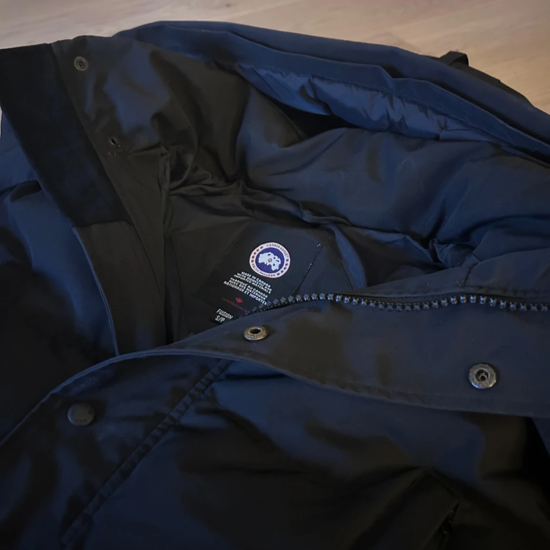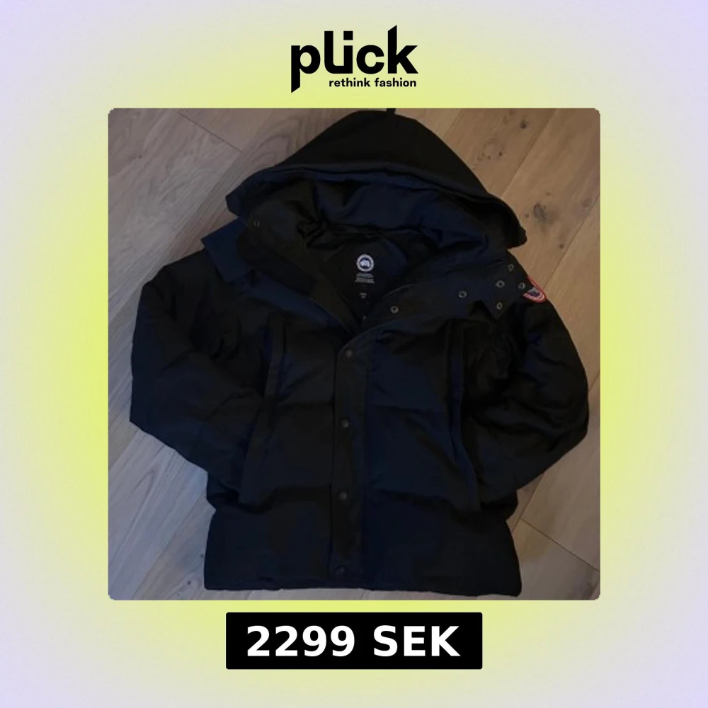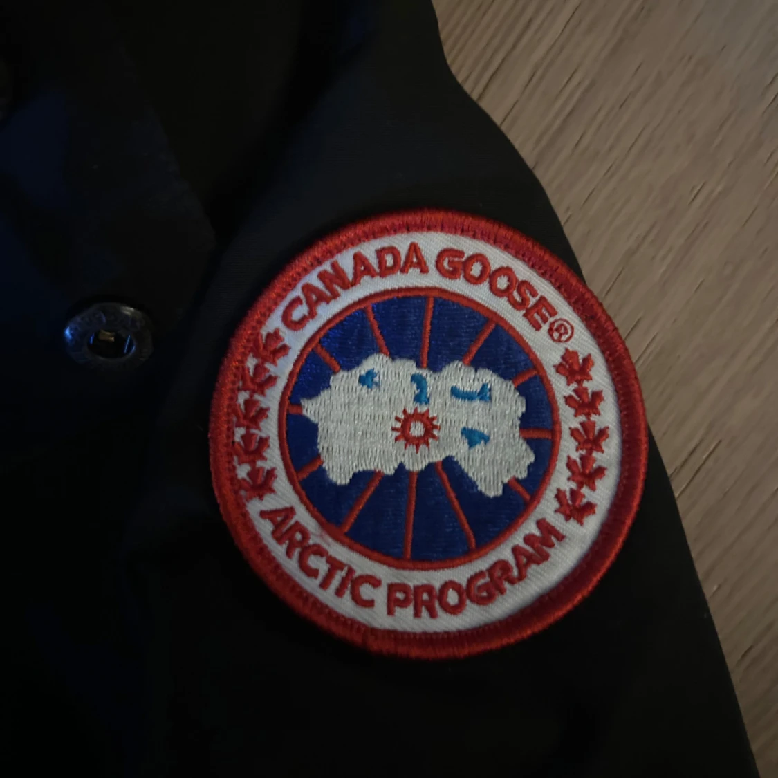 Säljer en svart dunjacka från Canada Goose med huva och klassisk logga på ärmen. Jackan har dragkedja och knappar framtill, är vadderad och perfekt för kalla dagar. Snygg och tidlös modell som håller värmen hela vintern.