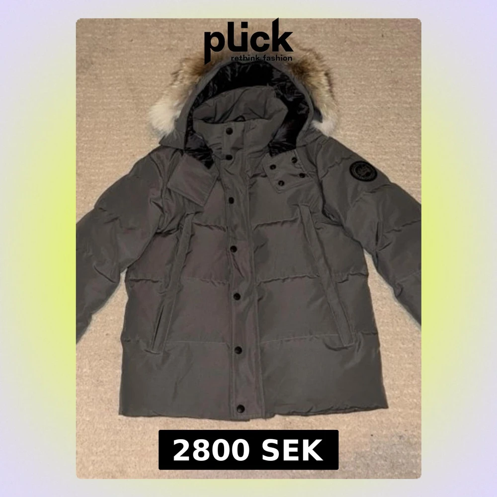Säljer en grå dunjacka från Canada Goose med svart logotyp på ärmen och avtagbar huva med päls. Jackan har långa ärmar, flera fickor och stängs med både dragkedja och knappar. Perfekt för kalla vinterdagar.