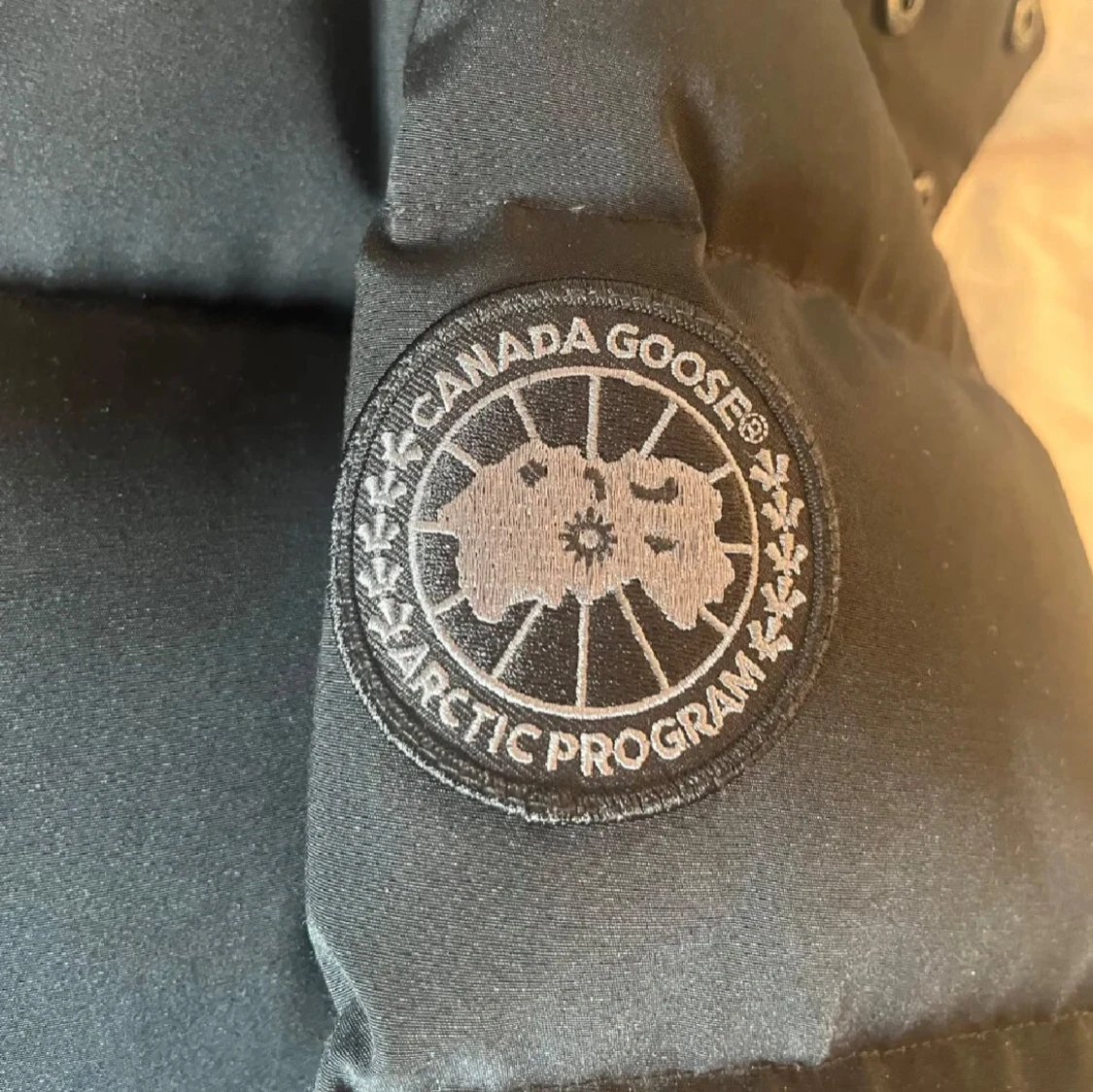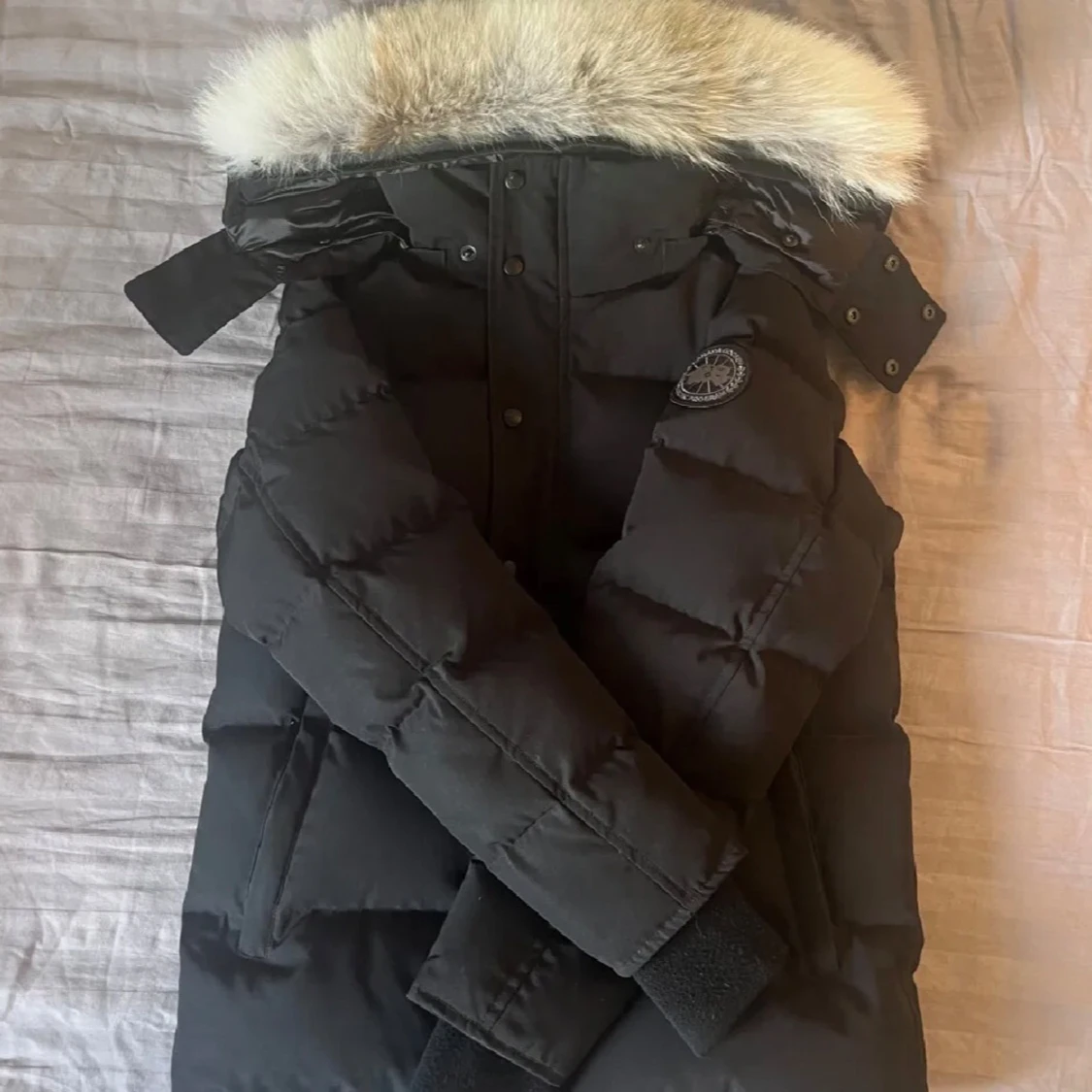 Säljer en svart dunjacka från Canada Goose (black lable) med stor fluffig päls runt huvan. Jackan har lång ärm, dragkedja och knappar framtill samt ribbade muddar. Klassisk patch på ärmen. Perfekt för kalla dagar. Priset kan diskuteras!