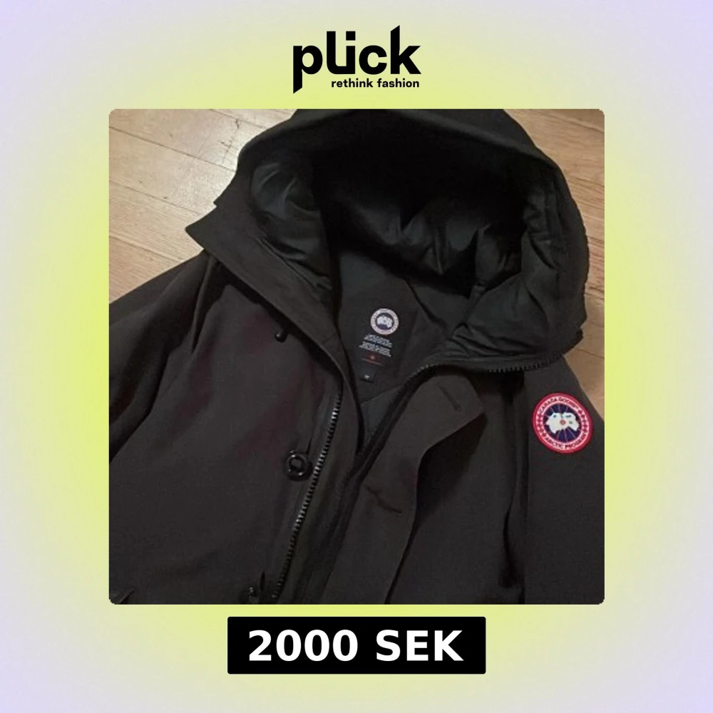 Säljer en svart dunjacka från Canada Goose med stor huva, dragkedja och knappar framtill. Jackan har klassisk logga på ärmen och är riktigt varm och skön. Perfekt för kalla vinterdagar och har en clean, stilren look.