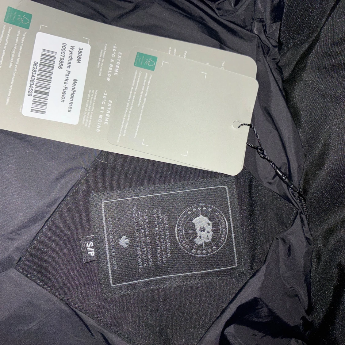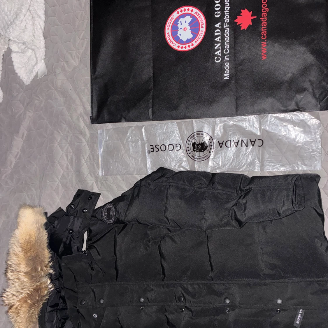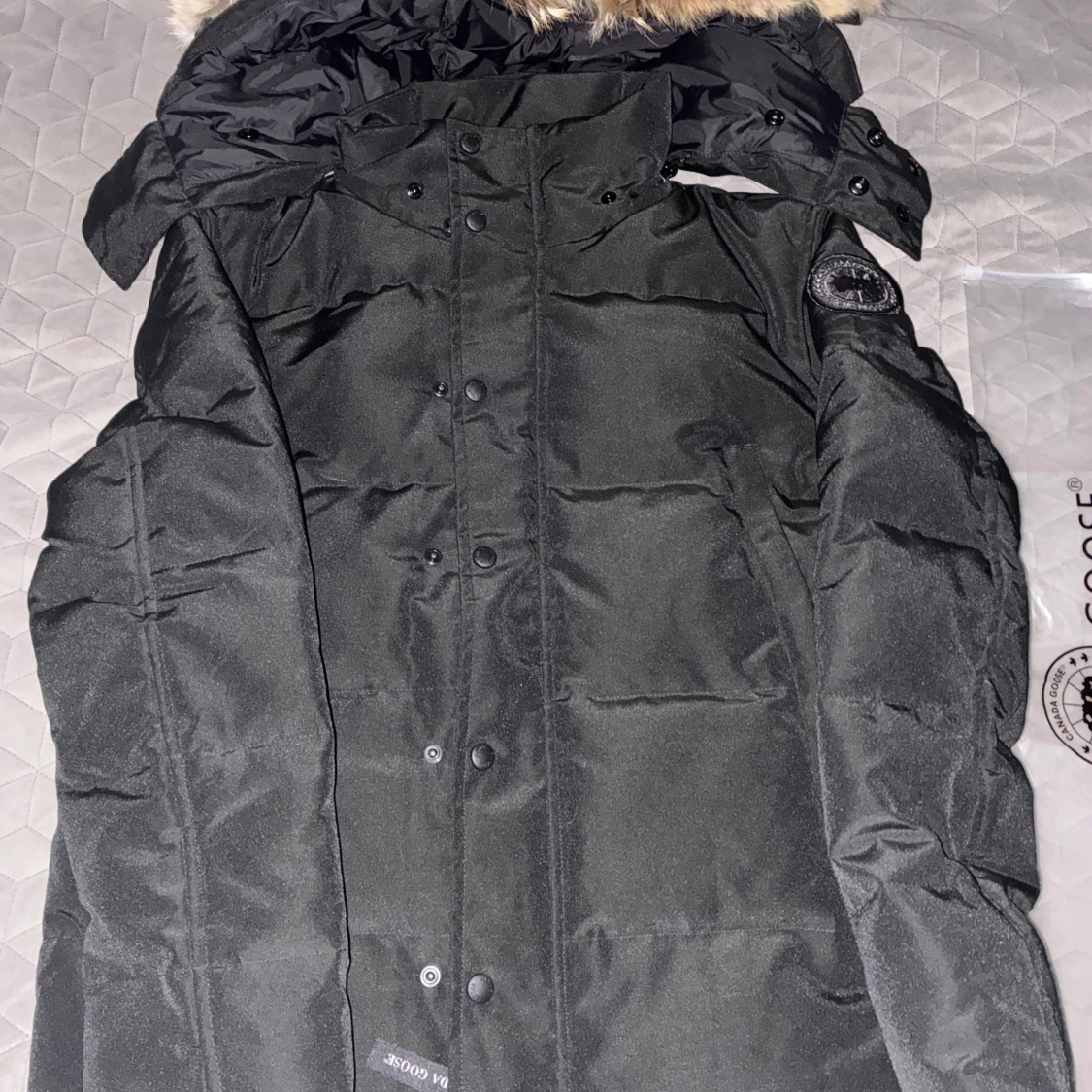 Säljer en svart Canada Goose dunjacka, modell Wyndham Parka. Jackan har pufferdesign, avtagbar huva med äkta päls och klassisk logga på ärmen. Perfekt för kalla vinterdagar och har snygga detaljer som knappar och dragkedja framtill.