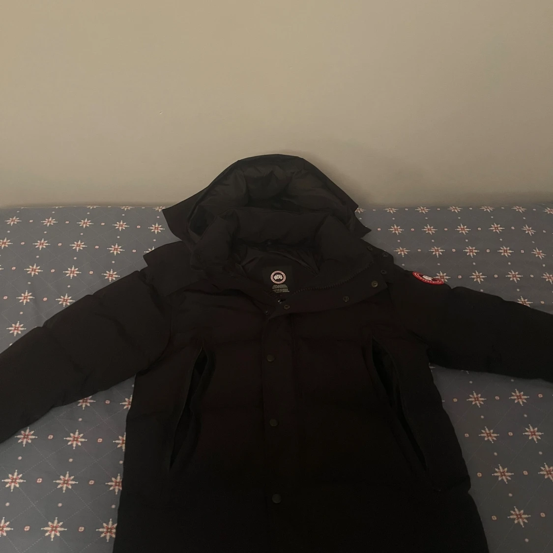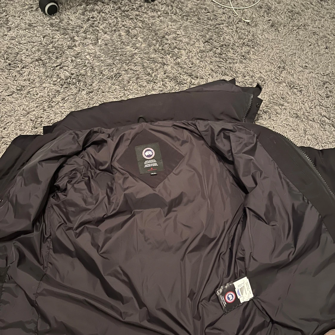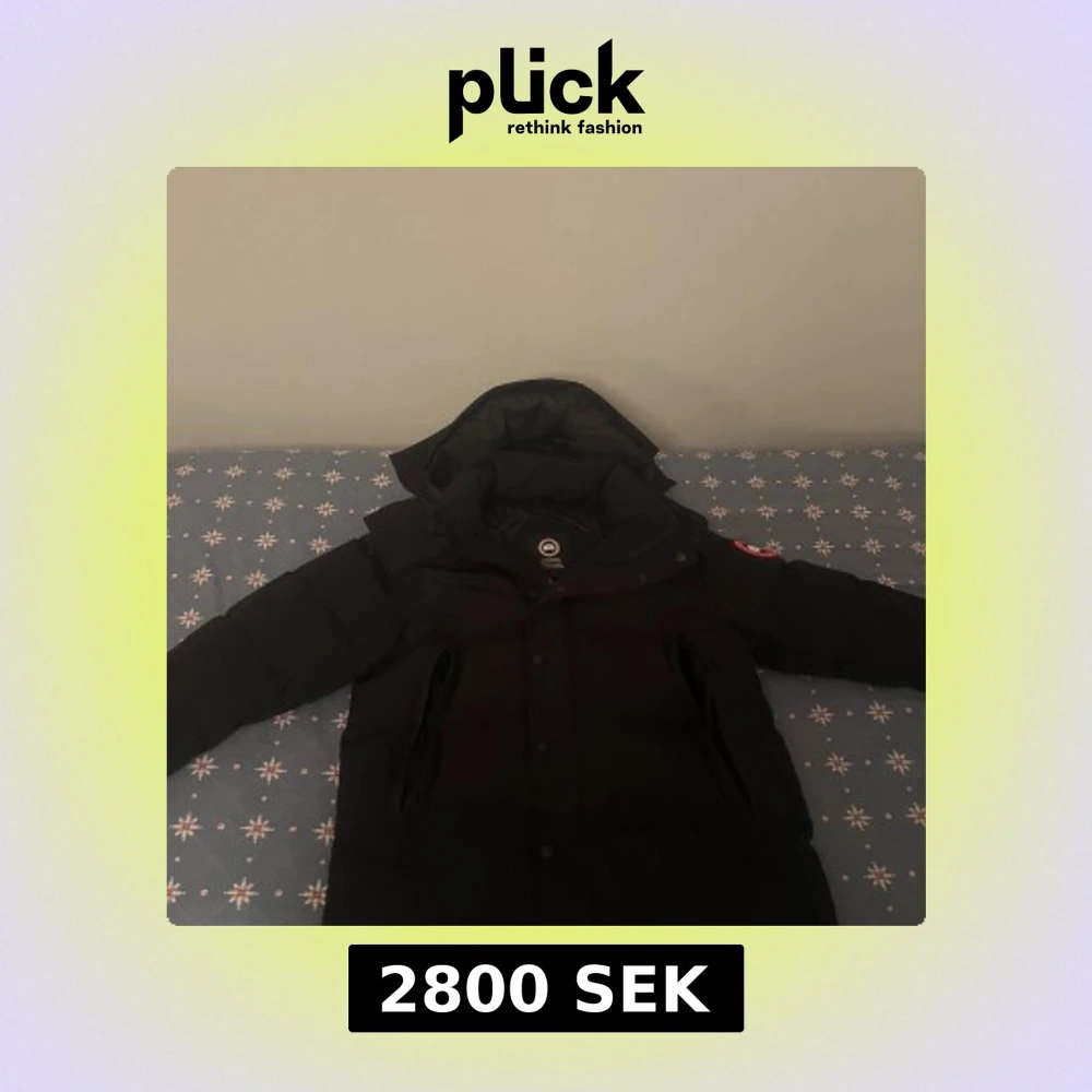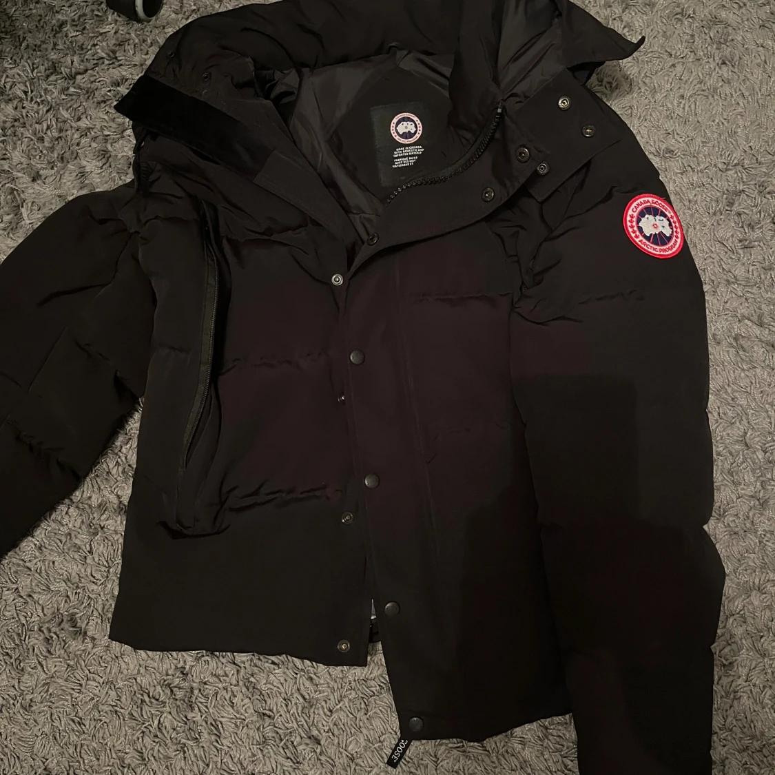 Säljer en svart dunjacka från Canada Goose med klassisk patch på ärmen. Jackan har huva, dragkedja och tryckknappar framtill. Fodrad insida och puffig design som håller dig varm under kalla dagar. Perfekt för dig som vill ha en stilren och funktionell vinterjacka. Päls och påse kommer med jackan.
