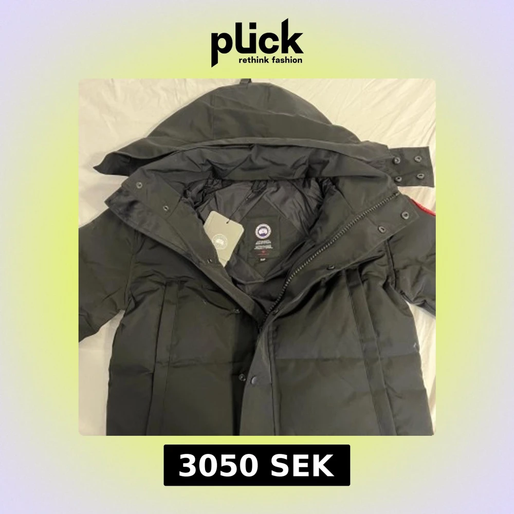 Svart dunjacka från Canada Goose med stor huva och klassisk logga på ärmen. Jackan har dragkedja och knappar framtill, samt quiltad design för extra värme. Perfekt för kalla dagar och har en clean, stilren look som funkar till allt.