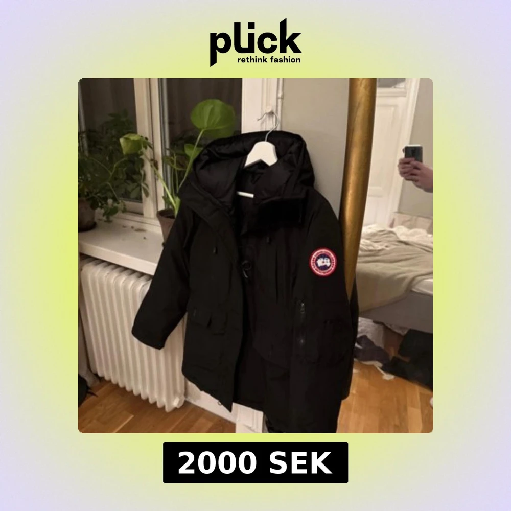 OBS- hål på ena fickan, går att sy” Svart dunjacka från Canada Goose med huva och klassisk logga på ärmen. Jackan har flera fickor framtill, dragkedja och knäppning. Perfekt för kalla vinterdagar och har en stilren look som funkar till det mesta.