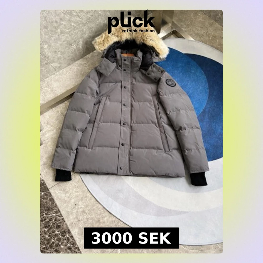 Säljer en grå dunjacka från Canada Goose med pälskantad huva och svart logotyp på ärmen. Jackan har quiltad design, långa ärmar med svarta muddar, dragkedja och knappar framtill samt två stora fickor. Perfekt för kalla vinterdagar.