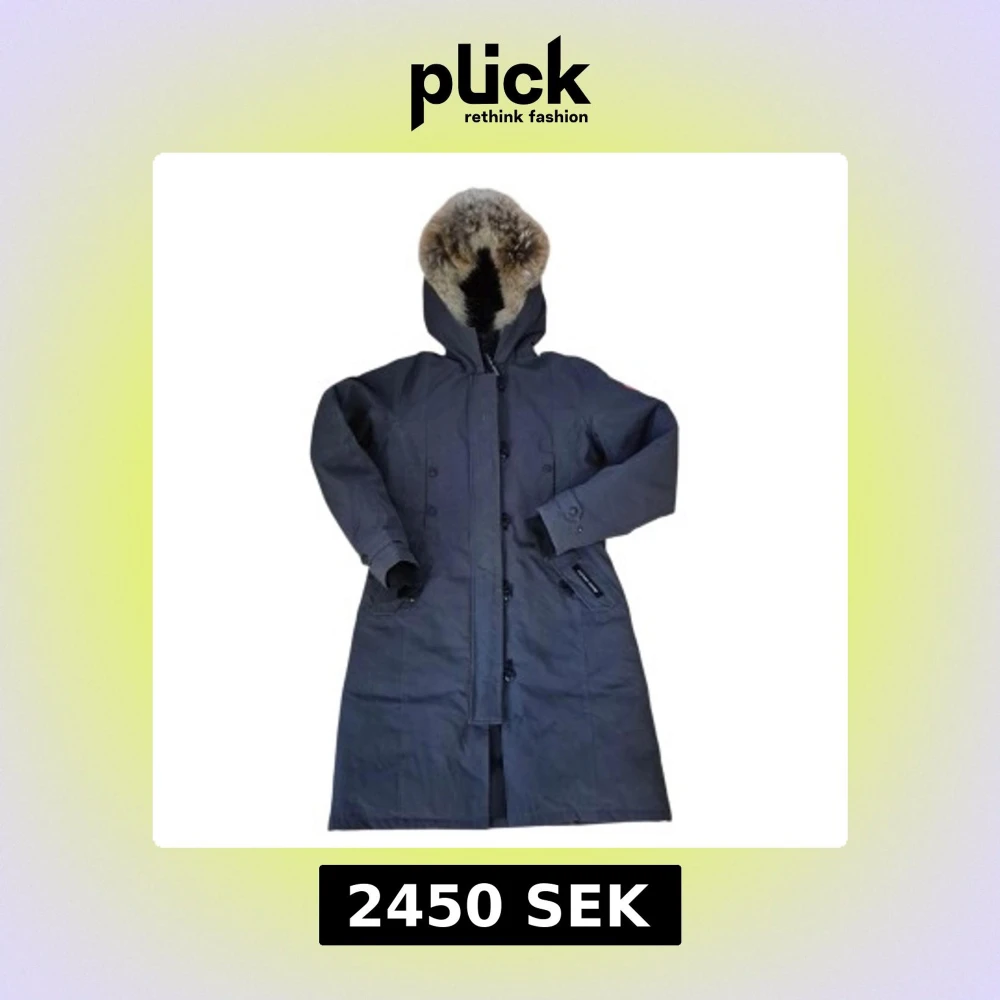 Säljer en lång, mörkblå parkas från Canada Goose med dunfyllning och päls på huvan. Jackan har flera fickor, knappar och dragkedja framtill samt klassisk logga på ärmen. Perfekt för kalla vinterdagar med sin varma och stilrena design.