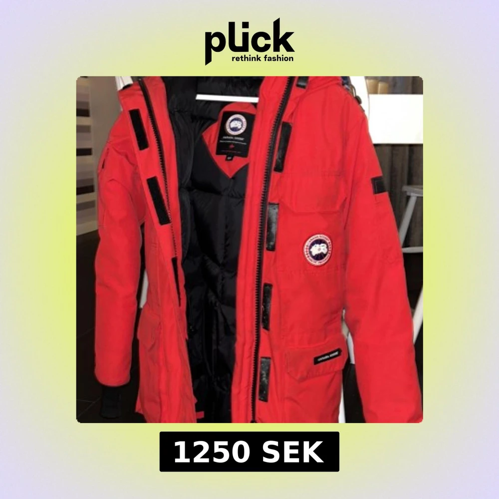 Röd vinterjacka från Canada Goose med huva och päls. Jackan har flera fickor, dragkedja och kardborreband framtill samt klassisk logotyp på bröstet. Perfekt för kalla dagar.