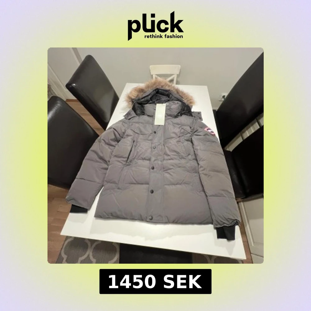 Säljer en grå dunjacka från Canada Goose i storlek XS men den sitter som en lite större S. Jackan har en fluffig huva med päls, ribbade muddar och klassisk logga på ärmen. Fylld med dun och har knappar framtill. Perfekt för kalla vinterdagar och har en clean, stilren look.